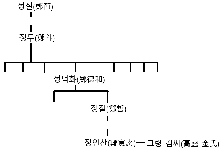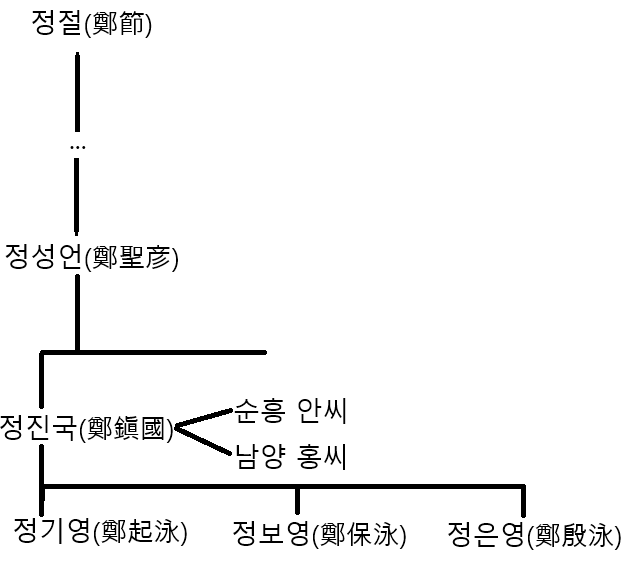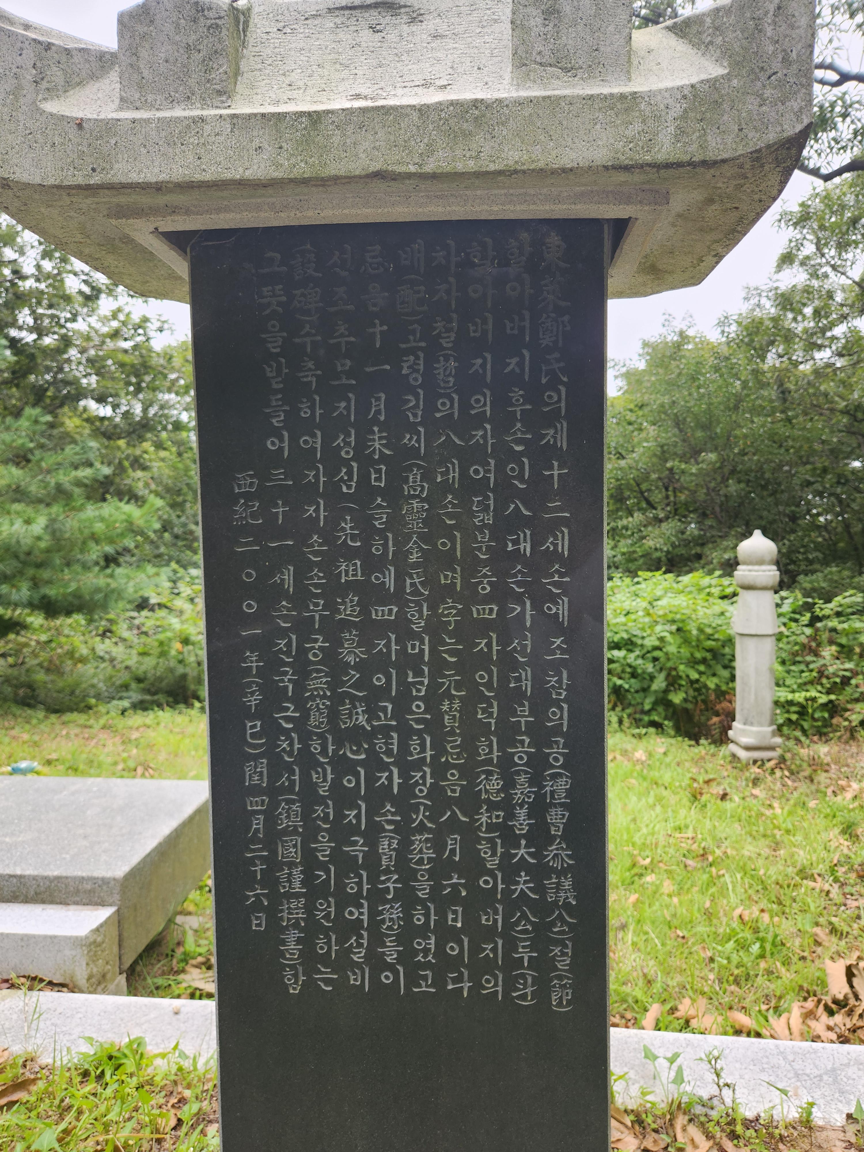 동래 정씨(東萊 鄭氏)의 제12세손 예조참의공(禮曹參議公) 절(節) 할아버지의 후손인 8대손 가선대부공(嘉善大夫公) 두(斗) 할아버지의 자(子) 여덟 분 중 사자(四子, 넷째 아들)인 덕화(德和) 할아버지의 차자(次子, 둘째 아들) 철(哲)의 8대손이며, 자(字)는 원찬(元贊), 기(忌) 음 8월 6일이다. 배(配, 배우자) 고령 김씨(高靈 金氏) 할머님은 화장(火葬)을 하였고, 기(忌) 음 11월 말일(末日), 슬하에 사자(四子)이고, 현자손(賢子孫)들이 선조추모지성심(先祖追慕之誠心)이 지극하여 설비(設碑) 수축 하여 자자손손 무궁(無窮)한 발전을 기원하는 그 뜻을 받들어 31세손 진국근찬서(鎭國謹撰書)함 서기 2001년(신사(辛巳)) 윤4월 26일 |