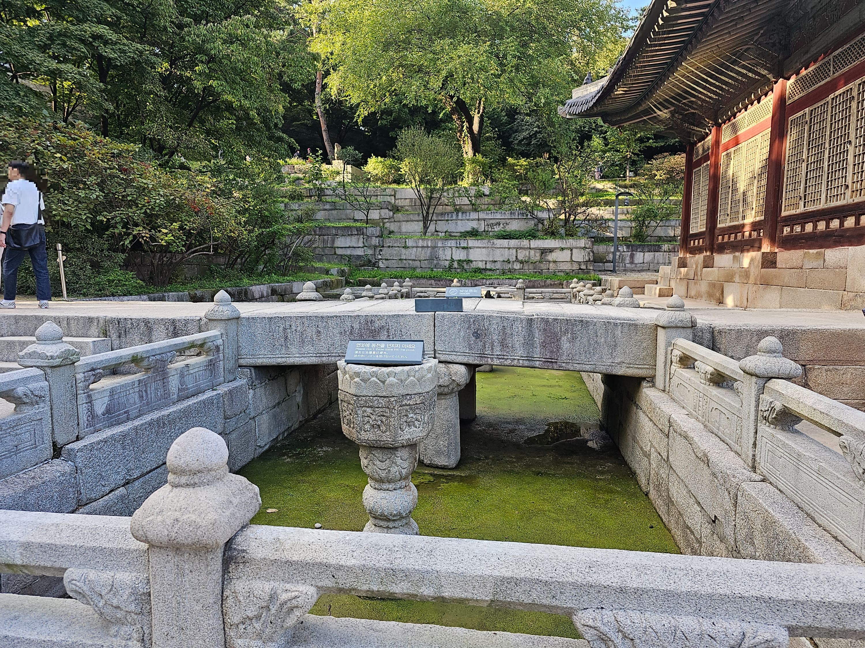 통명전(通明殿)은 1834년에 다시 세운 일상 생활공간인 내전의 중심 건물답게 넓은 월대를 쌓고 지붕 가운데 용마루가 없는 건물입니다. 가운데 세칸은 대청마루를 두고 양 옆에 온돌방을 두어 왕과 왕비의 침실로 썼다고 하네요. 서쪽 마당에는 동그란 샘과 네모난 연못이 있고, 그 사이의 물길을 돌로 공들여 만든 정원이 있습니다.