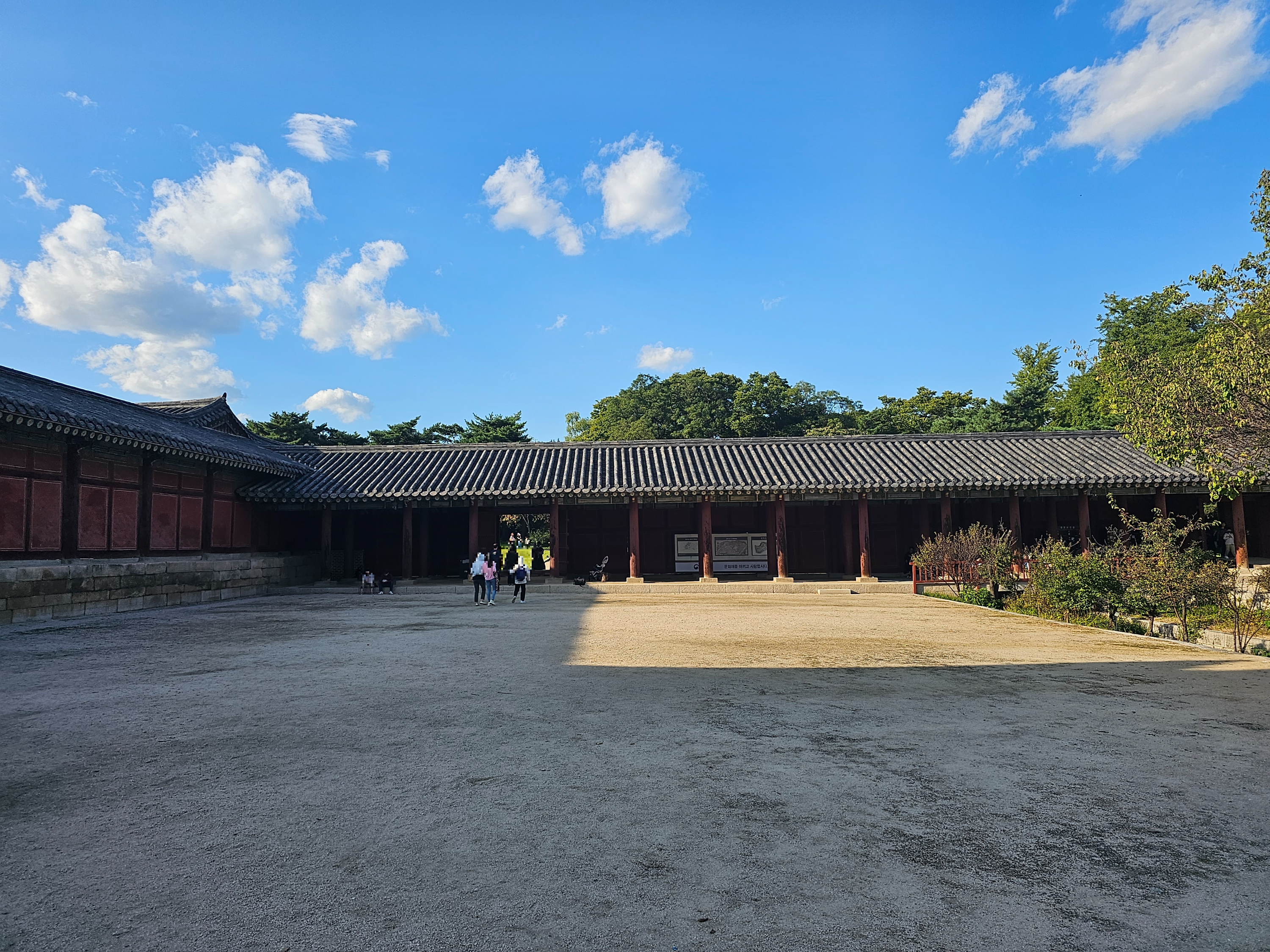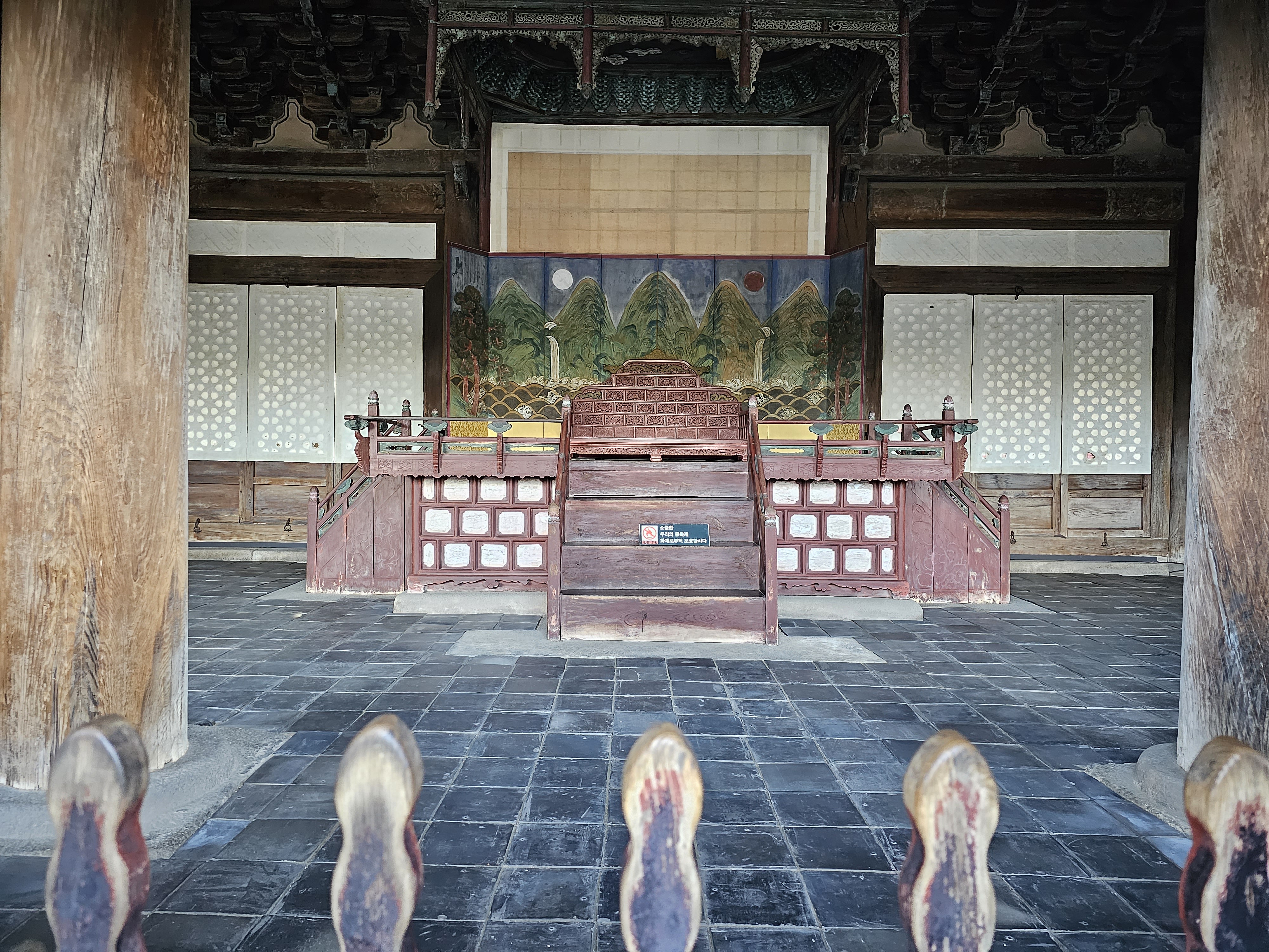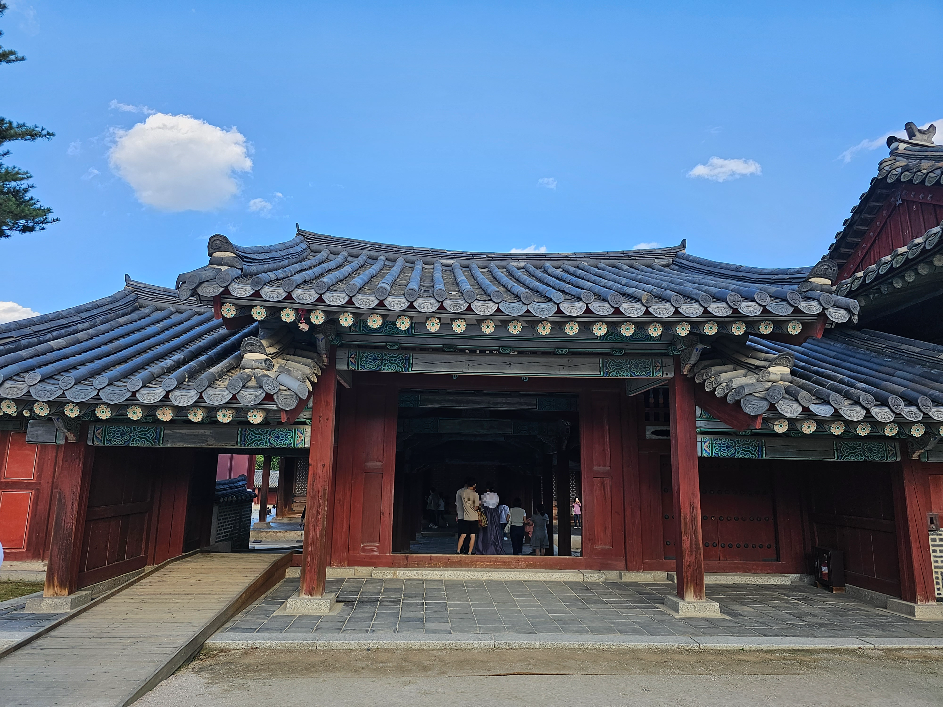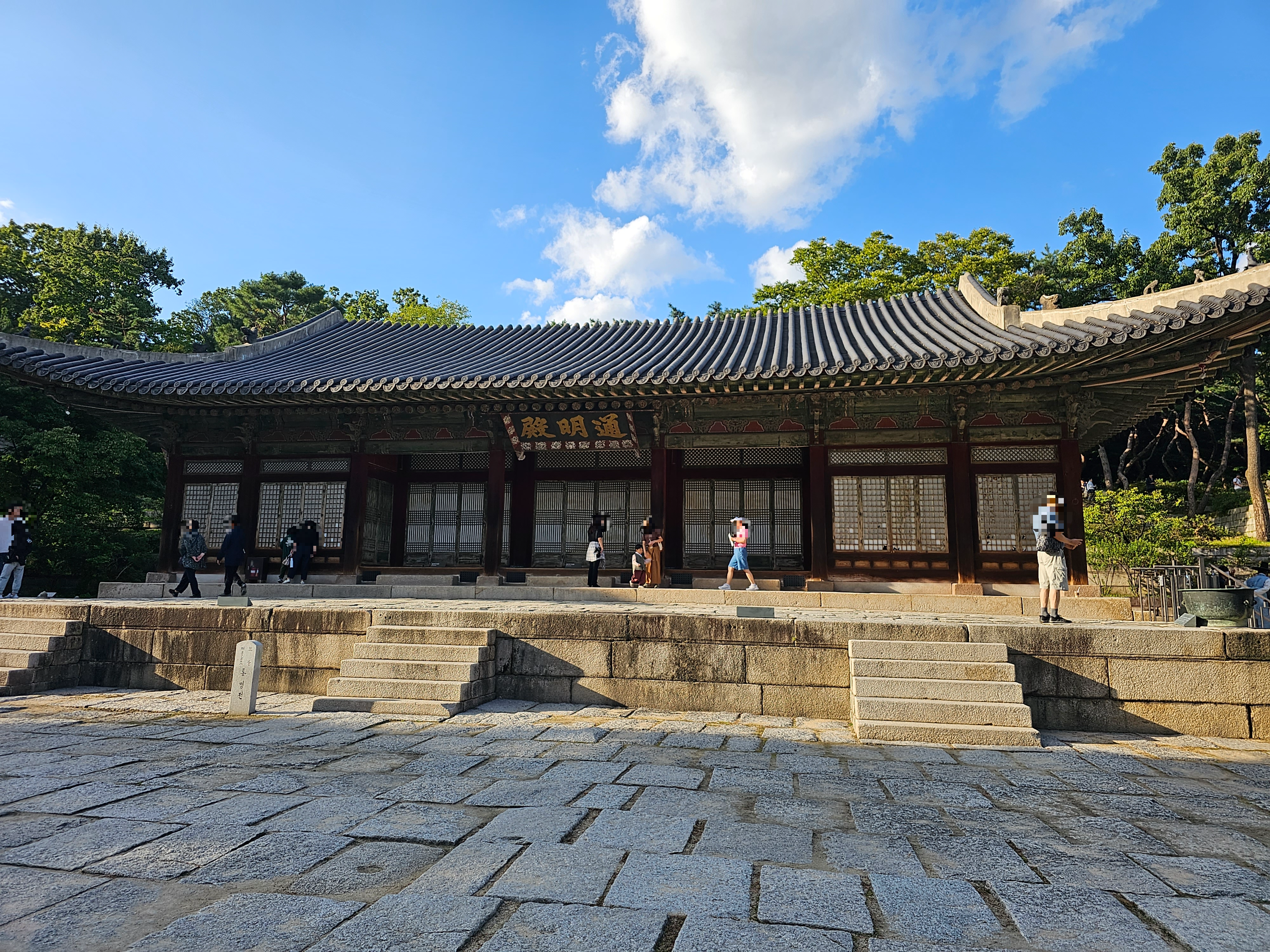 뒤쪽은 다른 건물로 연결되는 복도를 만들어서 통행의 편리함을 추구했죠. 명정문과 행각이 조정을 둘러싸고 있으며, 행각들은 왕실 친위부대의 주둔지나 왕실의 초상을 치르기 위한 재실로도 쓰였다고 합니다.