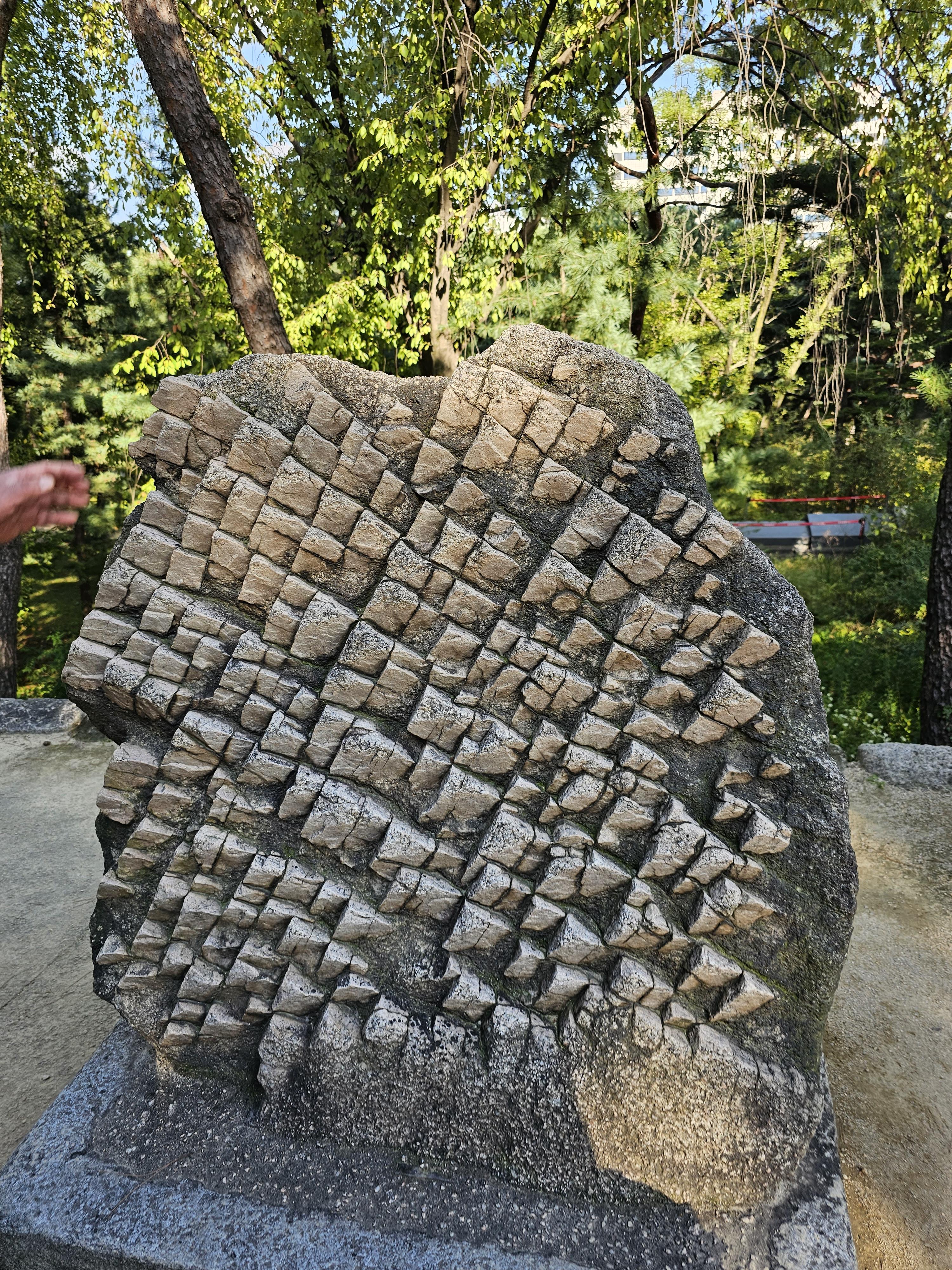 이 물은 통명전 서북쪽에 있는 샘물에서 내려온다고 합니다. 연못 북쪽에서 물이 떨어지는 부분은 봉황부리모양으로 물이 곡선으로 떨어지게 만들었죠. 또 이곳엔 사진처럼 괴석 2기도 세워져 있죠. 참고로 이 통명전 뒤뜰에는 열천(洌泉)이라는 지금은 쓰지 않는 작은 샘이 있는데, 궁금하시면 한 번 오신김에 가보시길 바랍니다.
