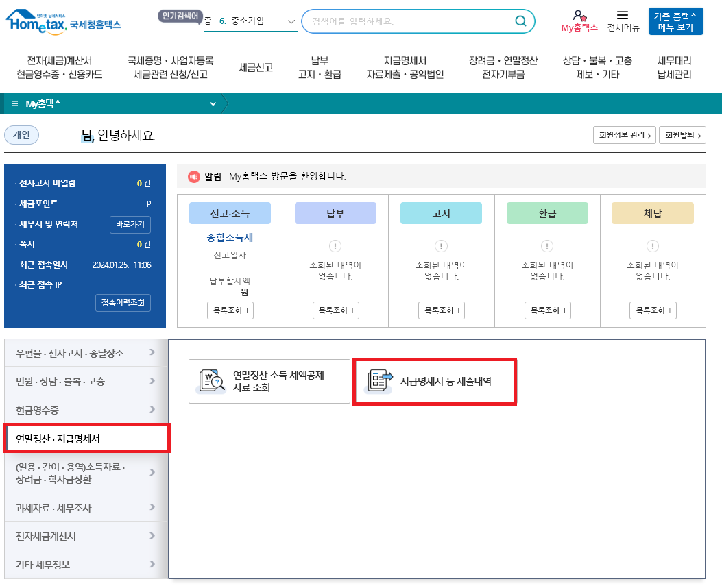 그 다음 왼쪽 아래의 [연말정산·지급명세서] 탭을 클릭하고 [지급명세서 등 제출내역] 버튼을 눌러주세요.