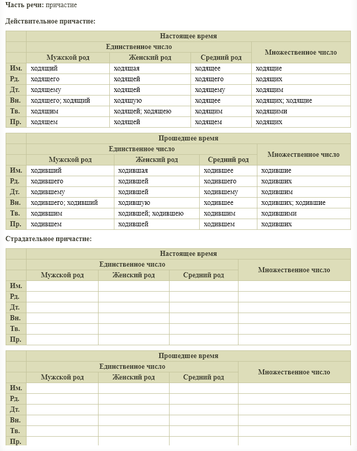 동사 ходить(걷다(걸어가다))를 검색해봤습니다. 이 동사가 동사의 미정형(동사원형)임을 보여주고, 그 동사의 직설법, 부동사(불완료상 부동사, 완료상 부동사), 형동사(능 형동사, 수동형동사)의 굴절형이 나옵니다.
