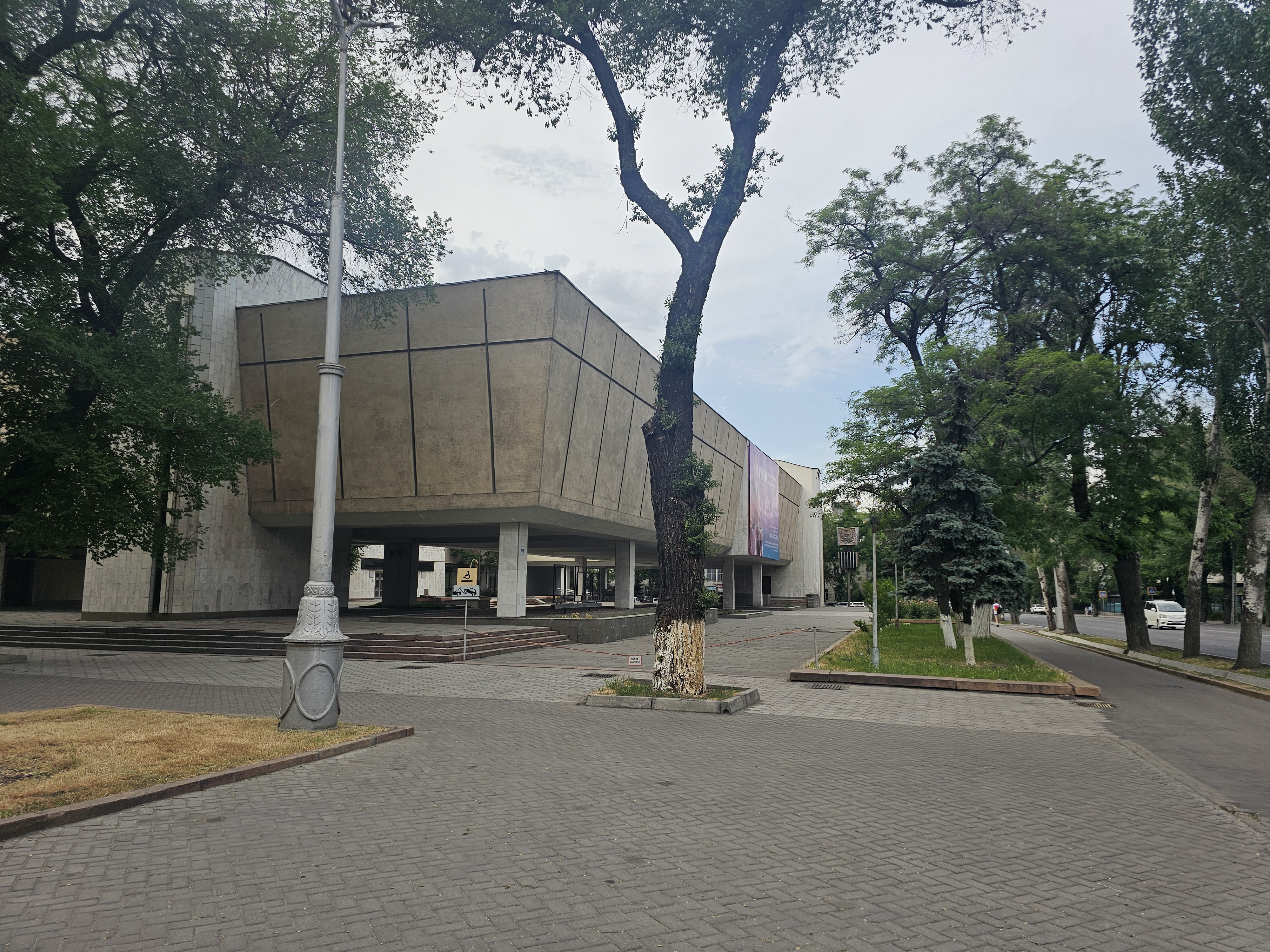 그 동상 의 서쪽엔 러시아드라마극장이 있습니다. 이 극장이 있는 공원은 칭기즈 아이트마토프 공원입니다.