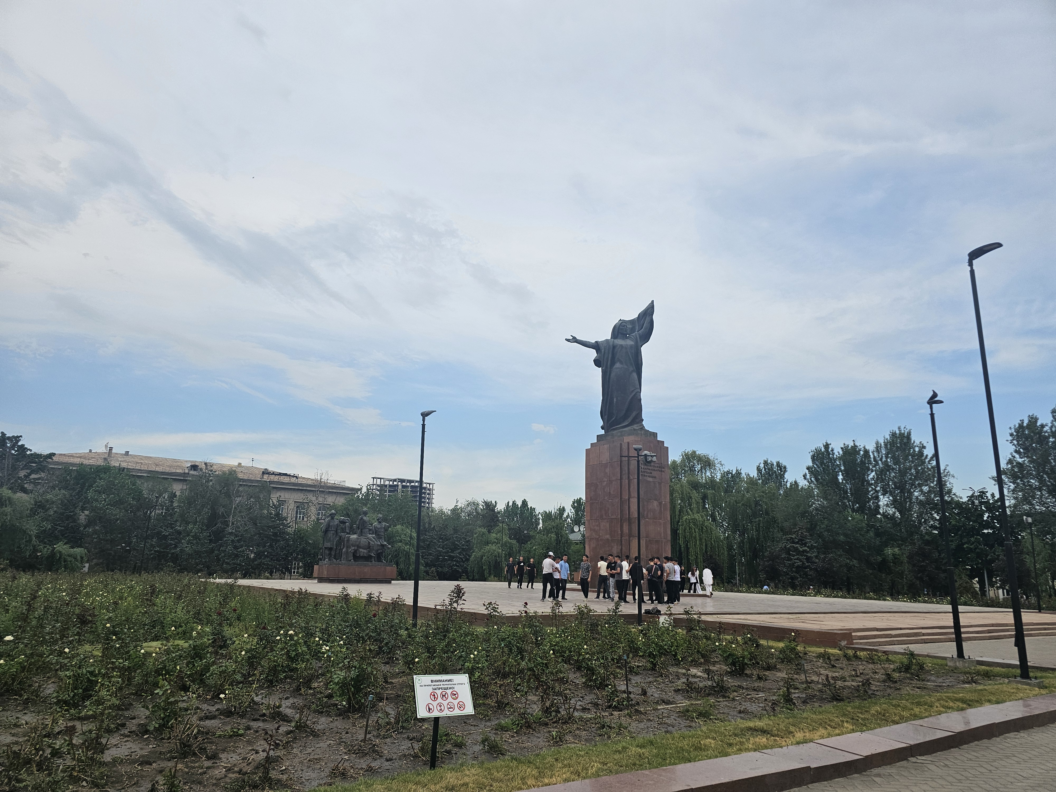 오페라발레극장을 건너오면 '발카(Балка)'라는 별칭으로 불렸던 아알리 토콤바예프(Аалы Токомбаев, 1904-1988)의 동상이 눈에 띕니다. 키르기스스탄의 인민시인이자 사회주의노동영웅이었던 그는 키르기스 문학과 키르기스 국문학사의 창시자 중 한 명으로 여겨집니다. 그는 추이주의 촌카인디(Чон-Кайынды)에서 태어났는데 1916년 중앙아시아 반란의 영향으로 중국으로 도망갔다가 돌아오게 되는데, 이 때 가족이 죽으면서 고아가 되었습니다. 이후 1922년에 타슈켄트 기숙학교(Ташкентская школа-интернат, (현)우즈베키스탄국립대학교)에 입학해 공부를 마치고, 시인이자 문학자가 됩니다.