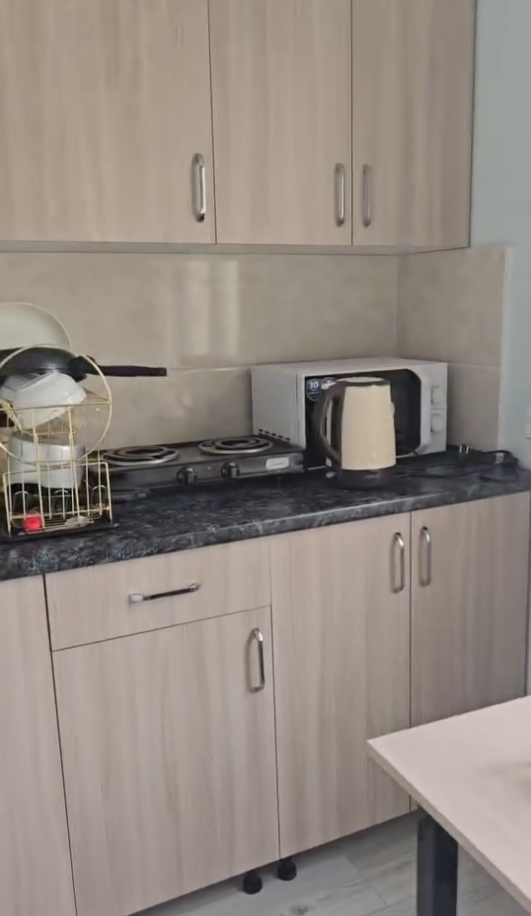 그 왼편에 식탁이 그 옆에는 조리대와 싱크대가 있습니다. 기본 제공 품목으로는 전자레인지, 가스레인지 여분의 접시와 수저, 찻주전자가 있었습니다.
