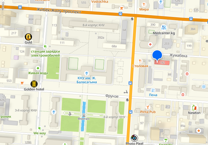 키르기스스탄국립대학교 본관까지 약 4분, 5번 건물까지 1~2분, 8번 건물까지 약 4~5분 거리로 주요 대학 건물과 매우 가까운 위치에 있습니다. 주변 환경이 편리해 수업과 학교 생활에 최적이죠.