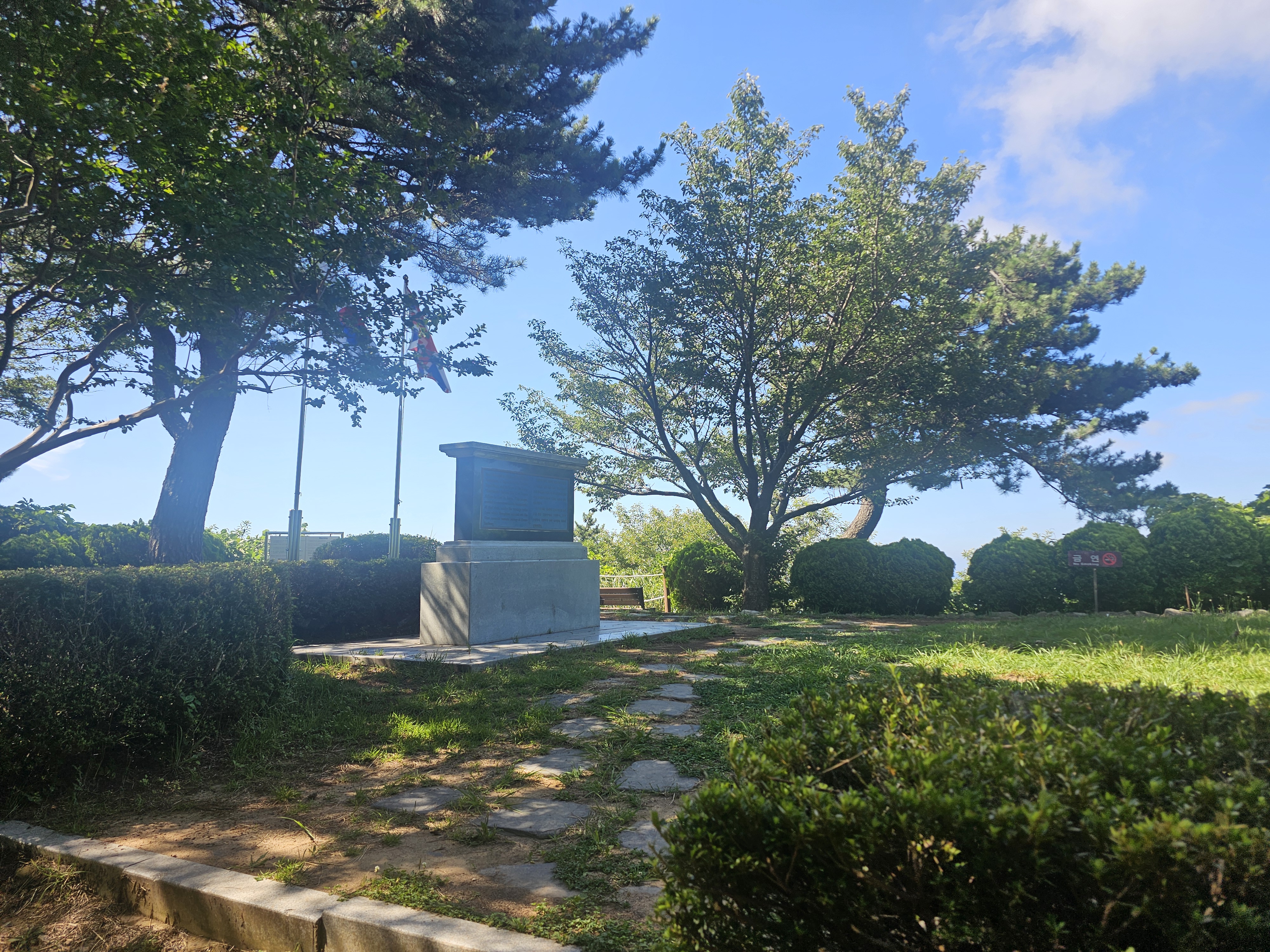신선대를 올라가다보면 오른편을 보면 바로 옆에일신정(日新亭)이라는 정자가 있고, 그 반댓편에는 화장실이 있습니다.한영첫만남기념비로 올라갑니다. 기념비에 다다르기 전 밑에 운동시설도