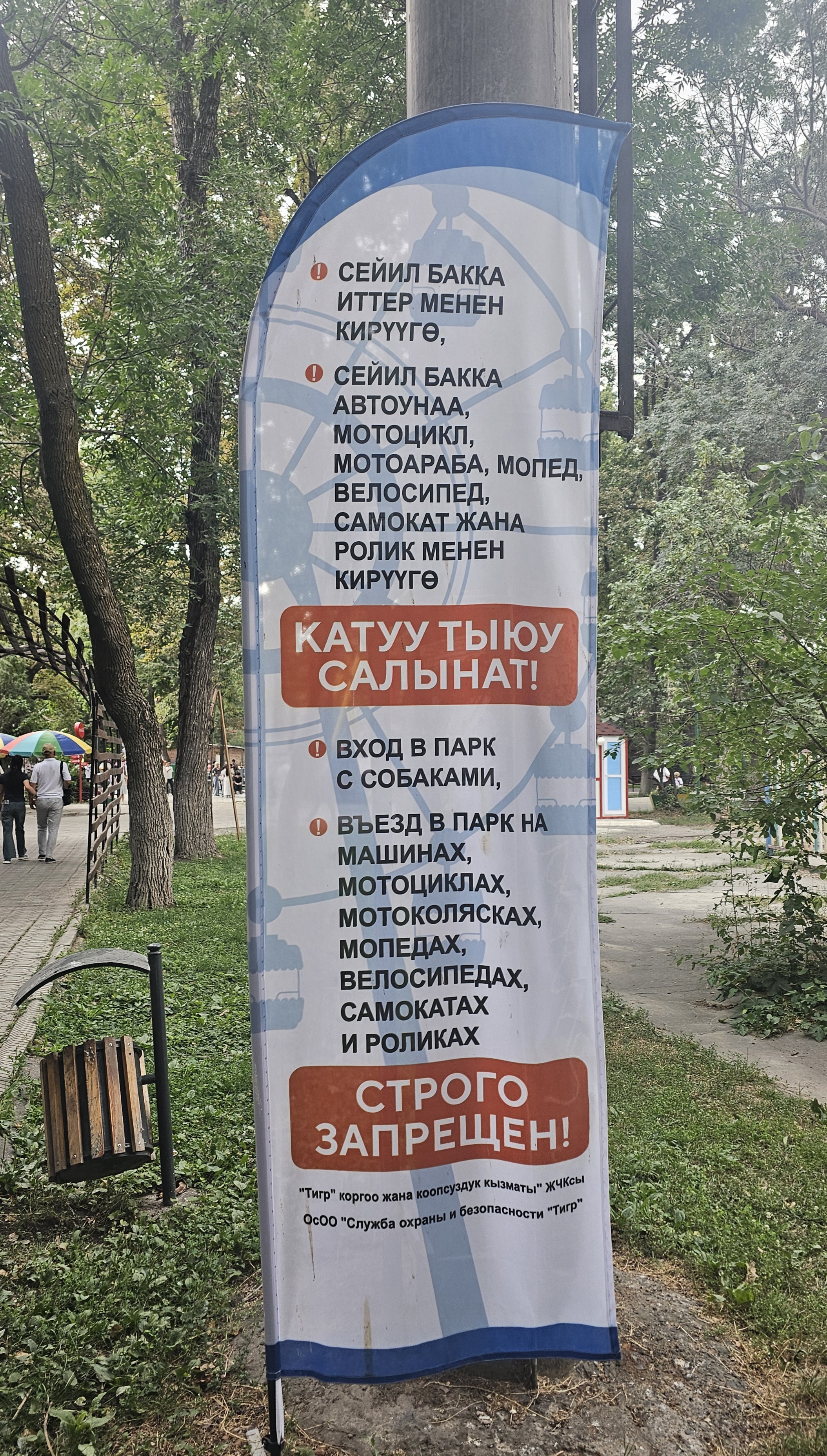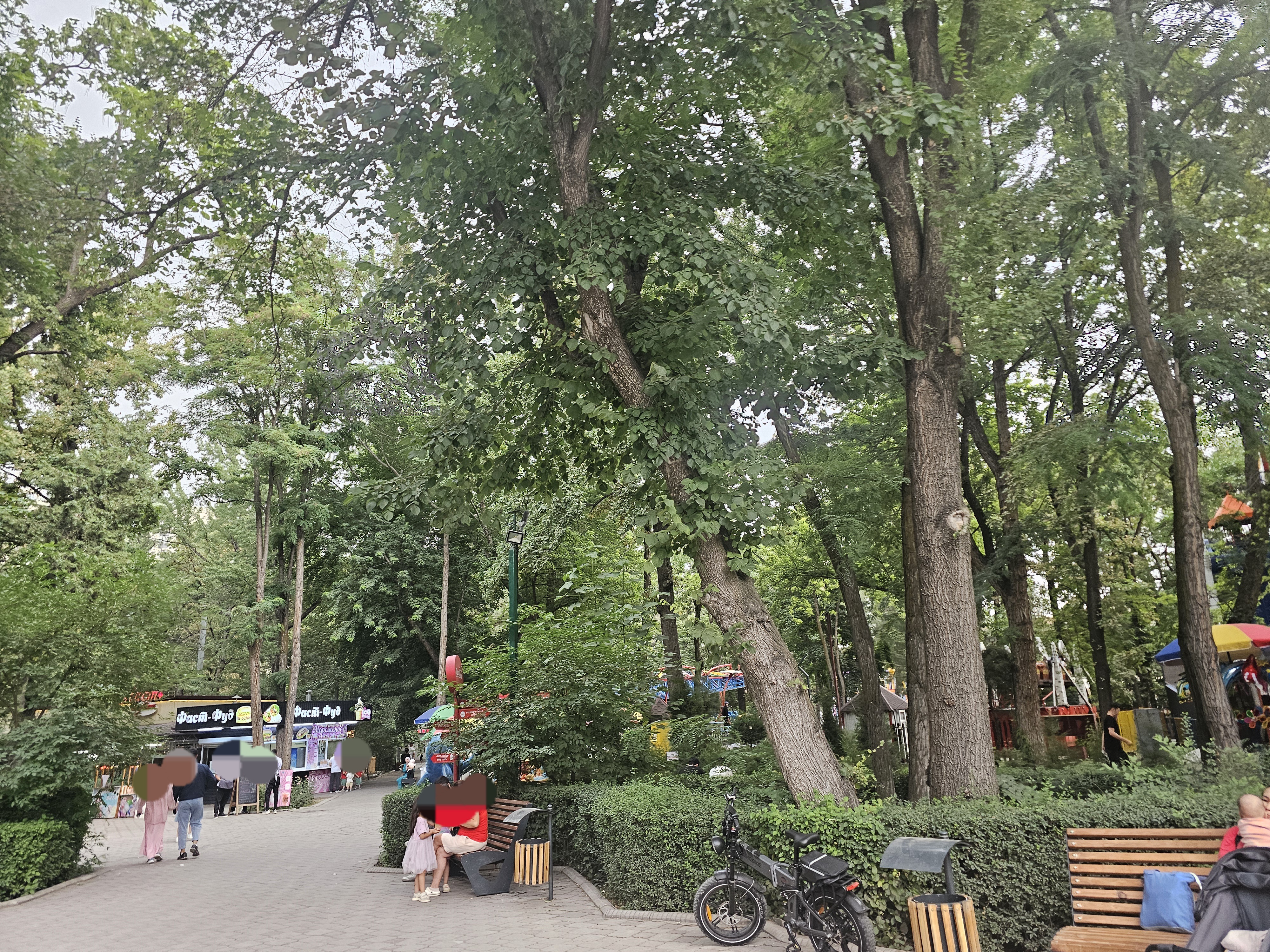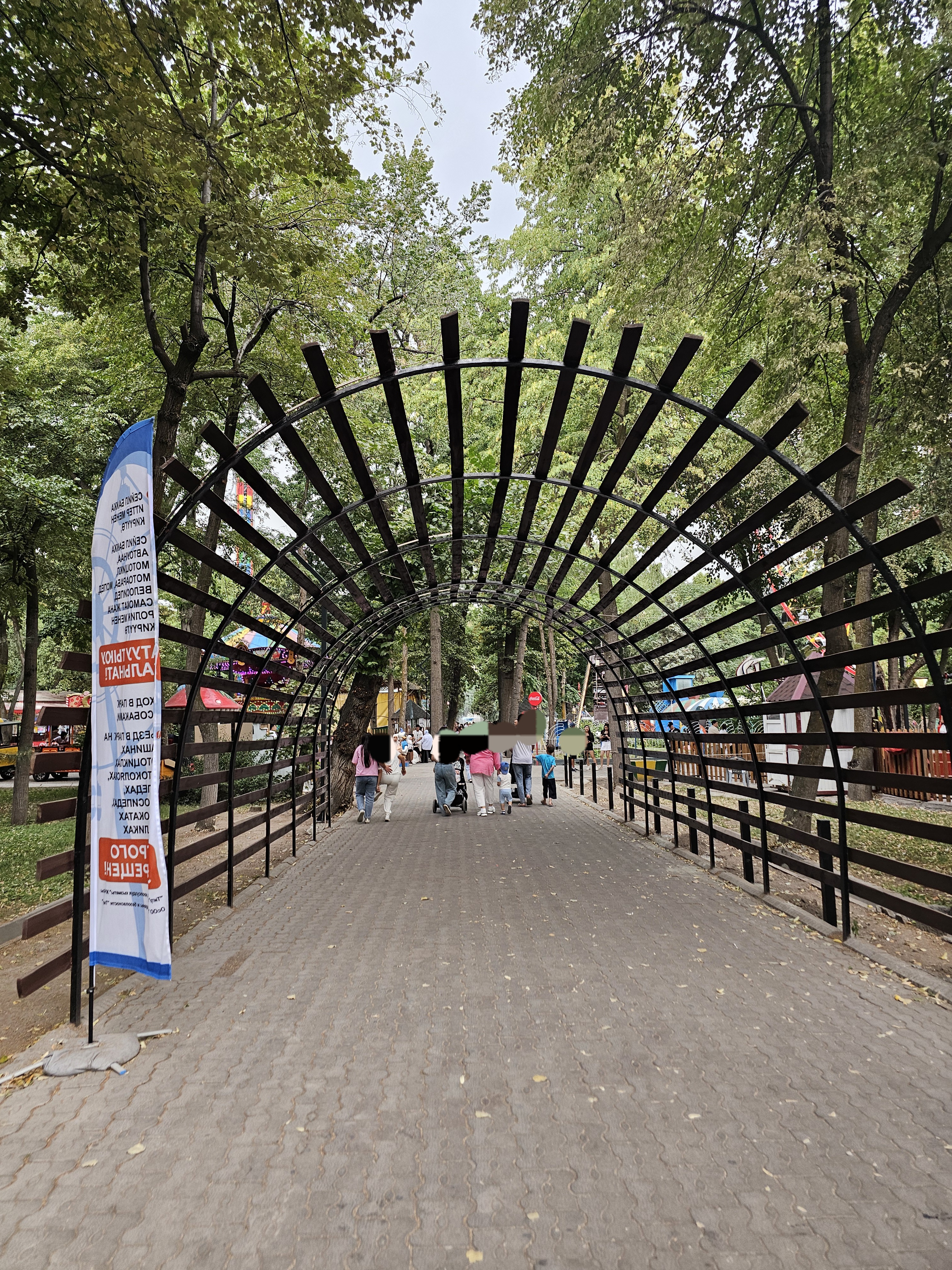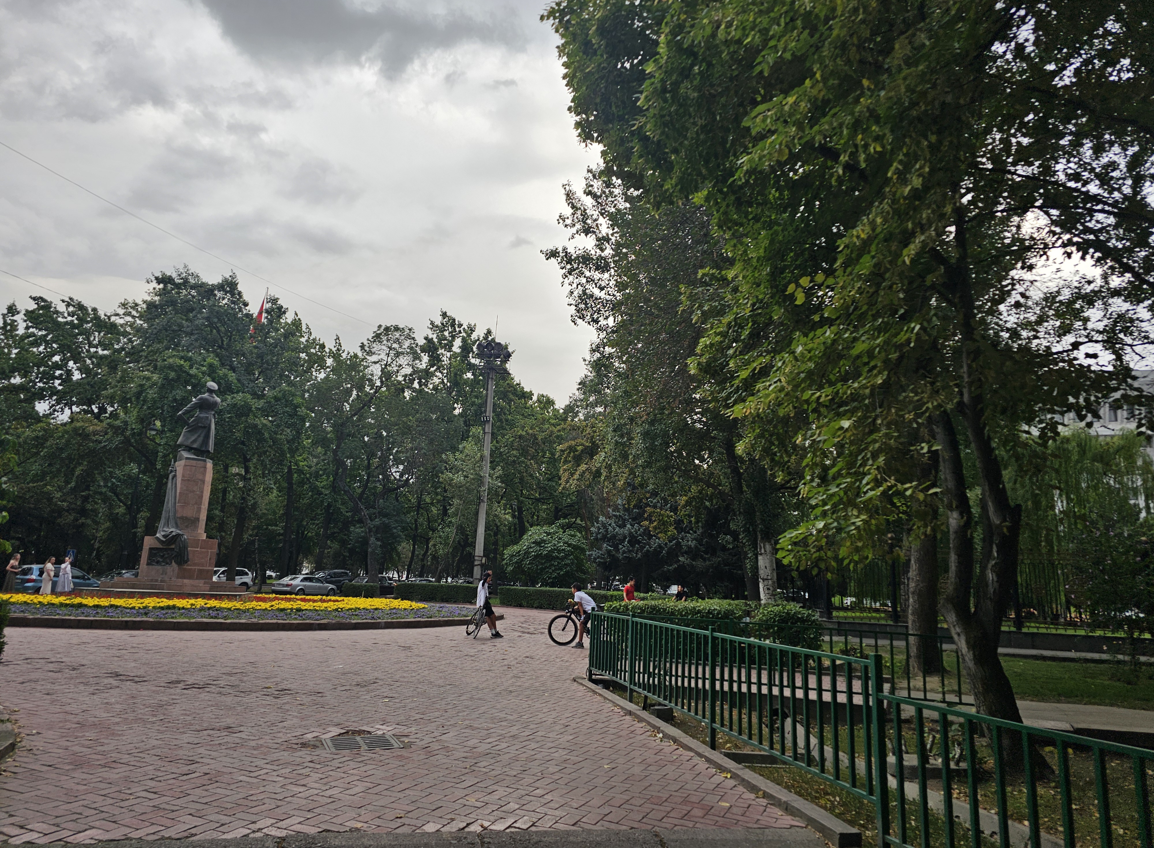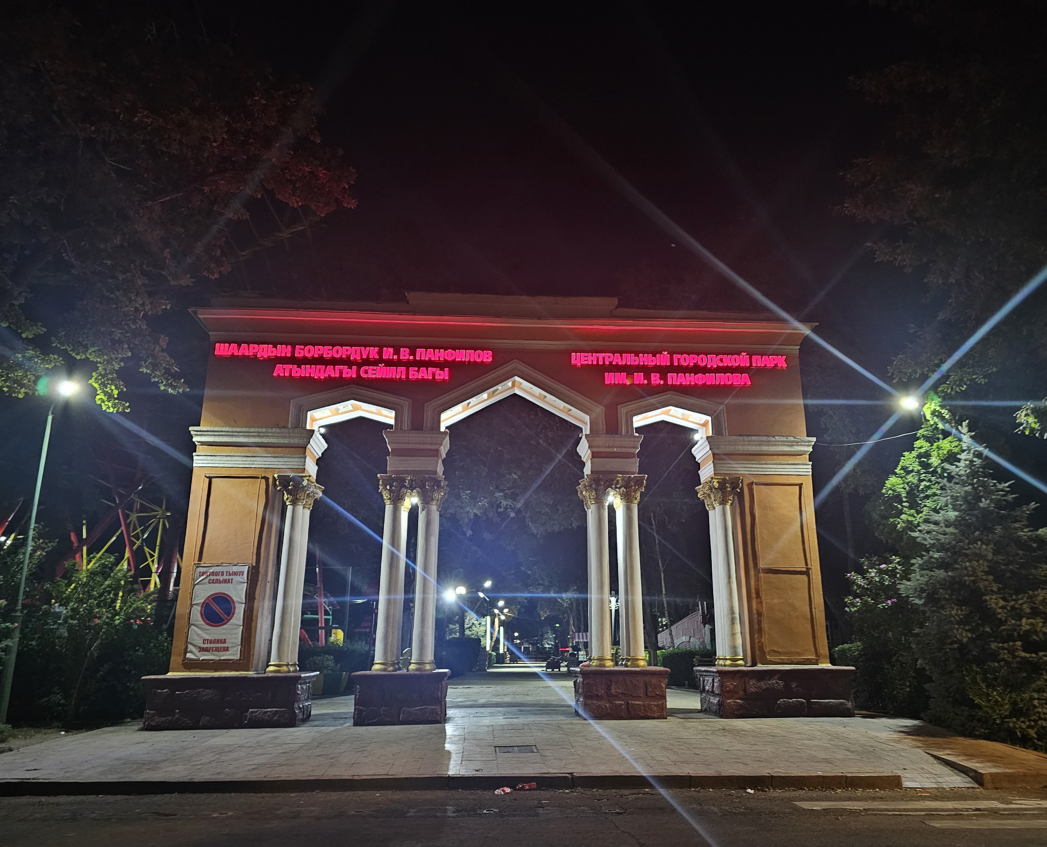 서남쪽입구입니다. 도시 중심 И. В. 판필로프 산책공원(шаардын борбордук И. В. Панфилов атындагы сейил багы)이란 이름과 함께 동화 속에 나올 것 같은 성 그림과 용 그림이 그려진 입구가 보입니다. 공원 지도를 보면 별모양으로 길이 난 것을 볼 수 있는데요. 실제로 1924년부터 시작된 공원 복원 사업으로 1926년에 붉은 별 공원(парк Красной звезды)이 개장했는데, 이때 공원의 한 편에 별 모양의 길을 냈다고 합니다. 어찌 보면 소련의 흔적이라고 볼 수 있죠.