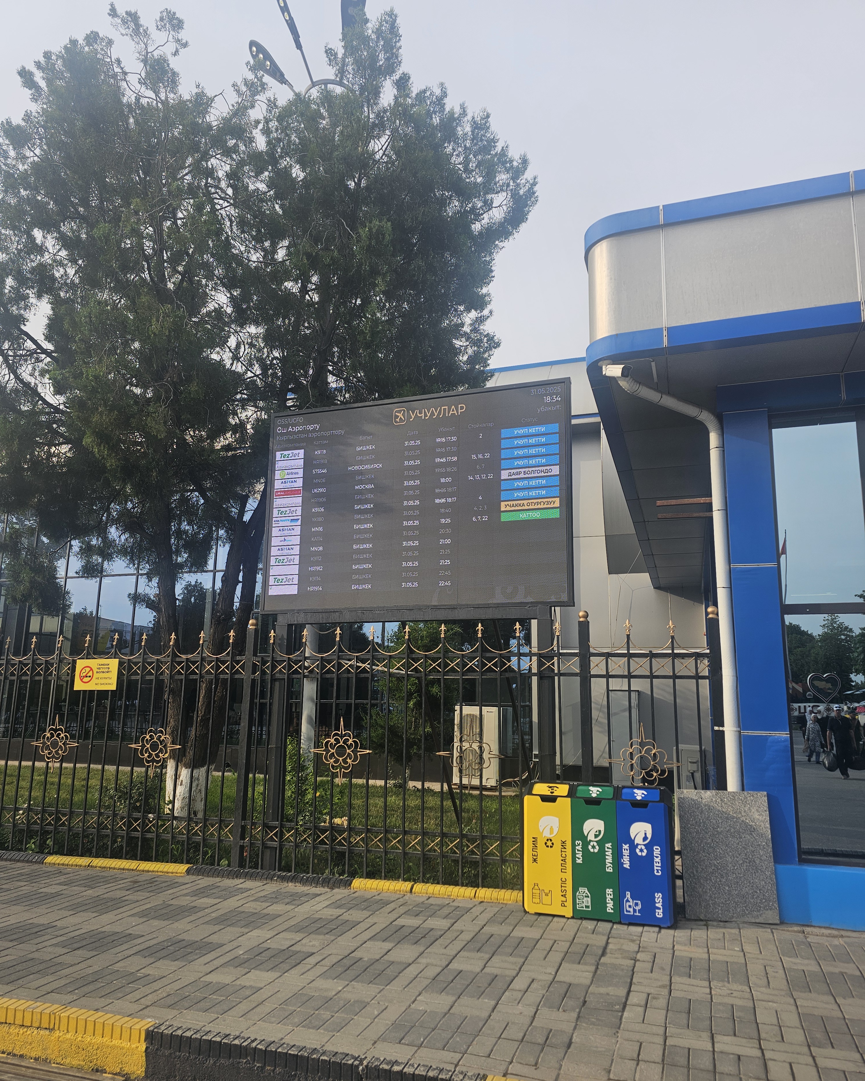오시국제공항 입구 왼편 전광판에는 비행기 시간표가 붙어져 있습니다. 들어가서 짐검사를 먼저 하게 됩니다. 키르기스스탄에서는 공항, 기차역과 같은 교통수단에서는 꼭 입구에서 짐검사를 먼저 합니다.
