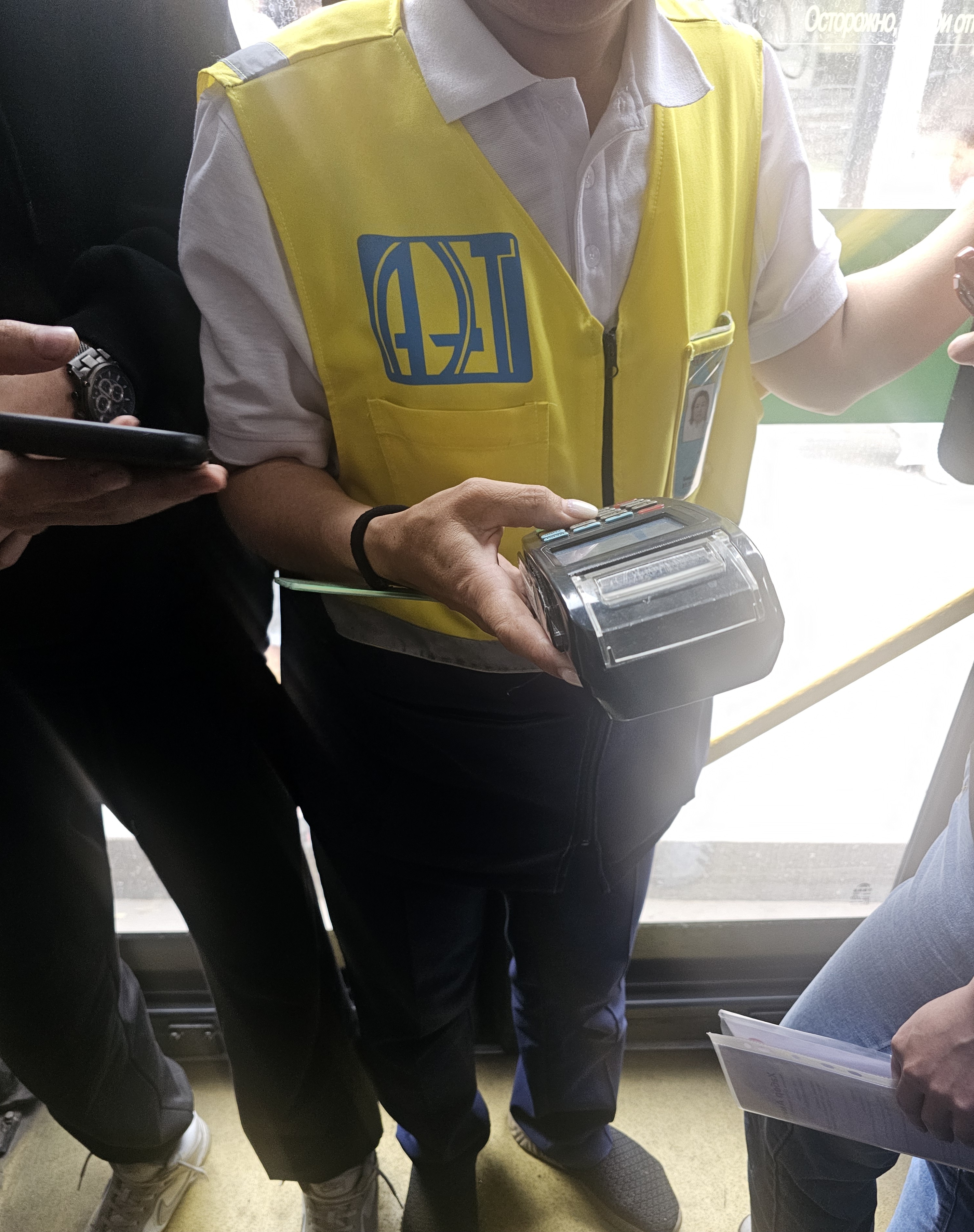 카자흐스탄 알마티에서는 버스감독원(버스검표원)이 수시로 돌아다닙니다. 이 때 카드를 감독원의 단말기에 찍으면 버스 단말기에 카드를 찍었는지 아닌지를 확인할 수 있습니다. 참고로, 현지에서는 감독관이 타는걸 보고 그 때서야 버스카드를 찍거나 QR결제를 하는 경우도 자주 보였고, 감독관이 타는 순간 버스에서 내려 다른 버스를 기다리는 모습도 볼 수 있었습니다.