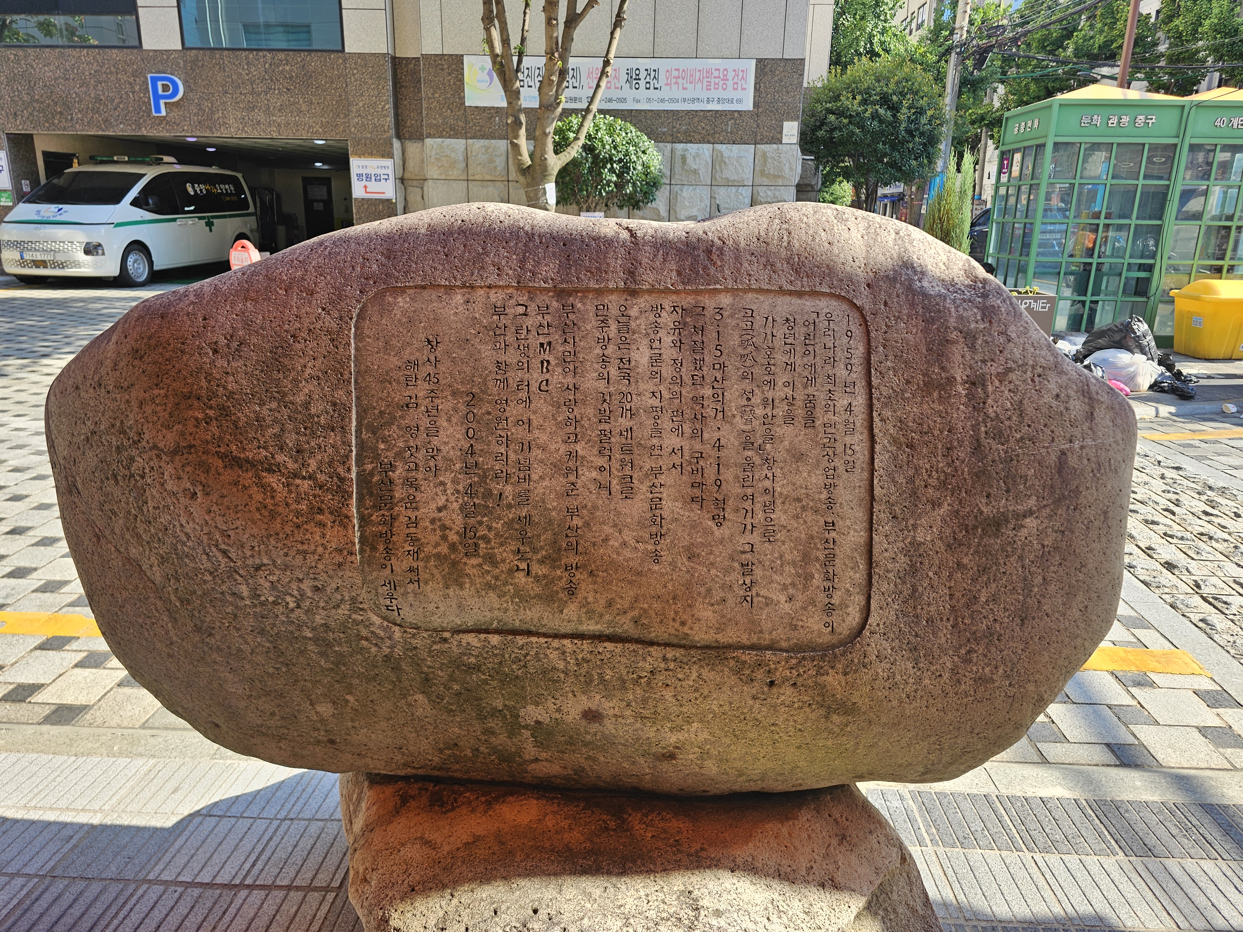 1959년 4월 15일, 부산문화방송이 개국했는데, 연주소(演奏所, 프로그램 제작 후 송신소, 지역국, 위성국 등으로 송출하는 곳)는 이 기념비가 있는 곳 부근인 부산시 중구 중앙동 3가 3번지(현) 중앙나라요양병원)에서 개국합니다. 처음엔 아침 6시 30분부터 8시 40분, 오후 6시 30분부터 밤 11시까지 두 차례로, 하루에 평균 6시간 40분간 방송을 진행했는데, 음악 방송과 보도 방송 위주로 운영되었다고 합니다.