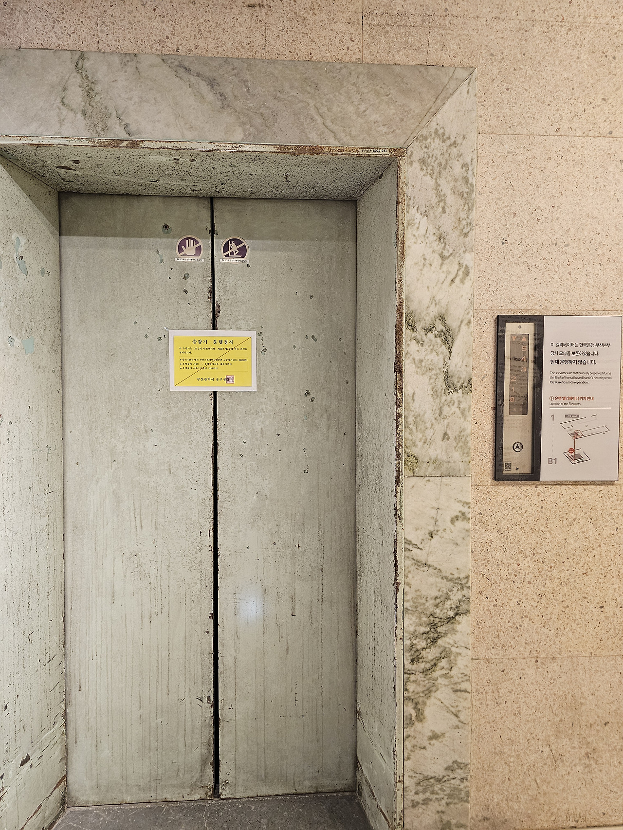 입구에는 한국은행 부산본부가 이곳에서 활동하던 당시에 쓰였던 엘리베이터가 보존되어 있습니다.