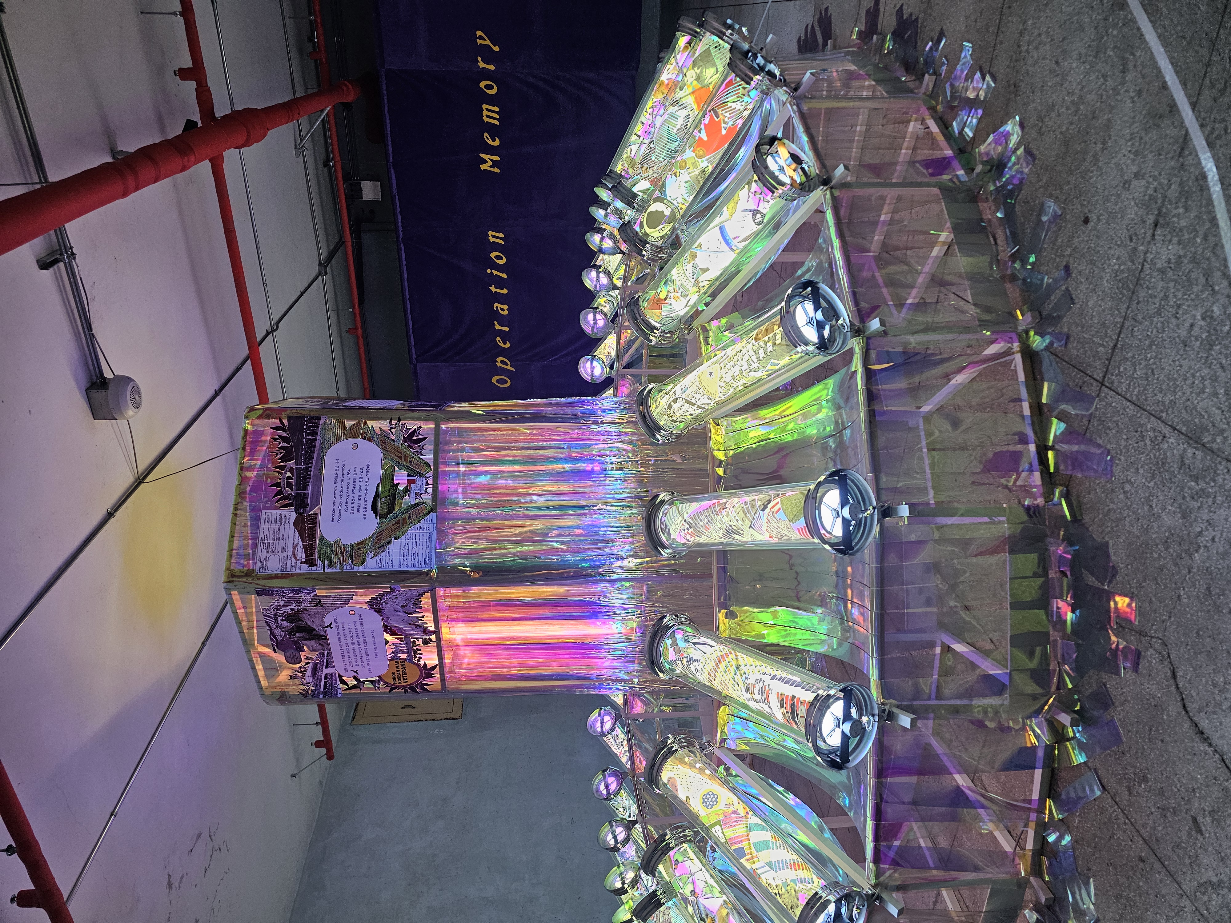 여기에선 재한유엔기념공원을 묘사한 작품이 있습니다. 벽면에는 '기억 작전(Operation Memory)'라는 글귀와 함께, 한국전쟁 당시 유엔군의 기억을 담은 통들이 화려하면서 절제적으로 돌아가고 있었습니다.