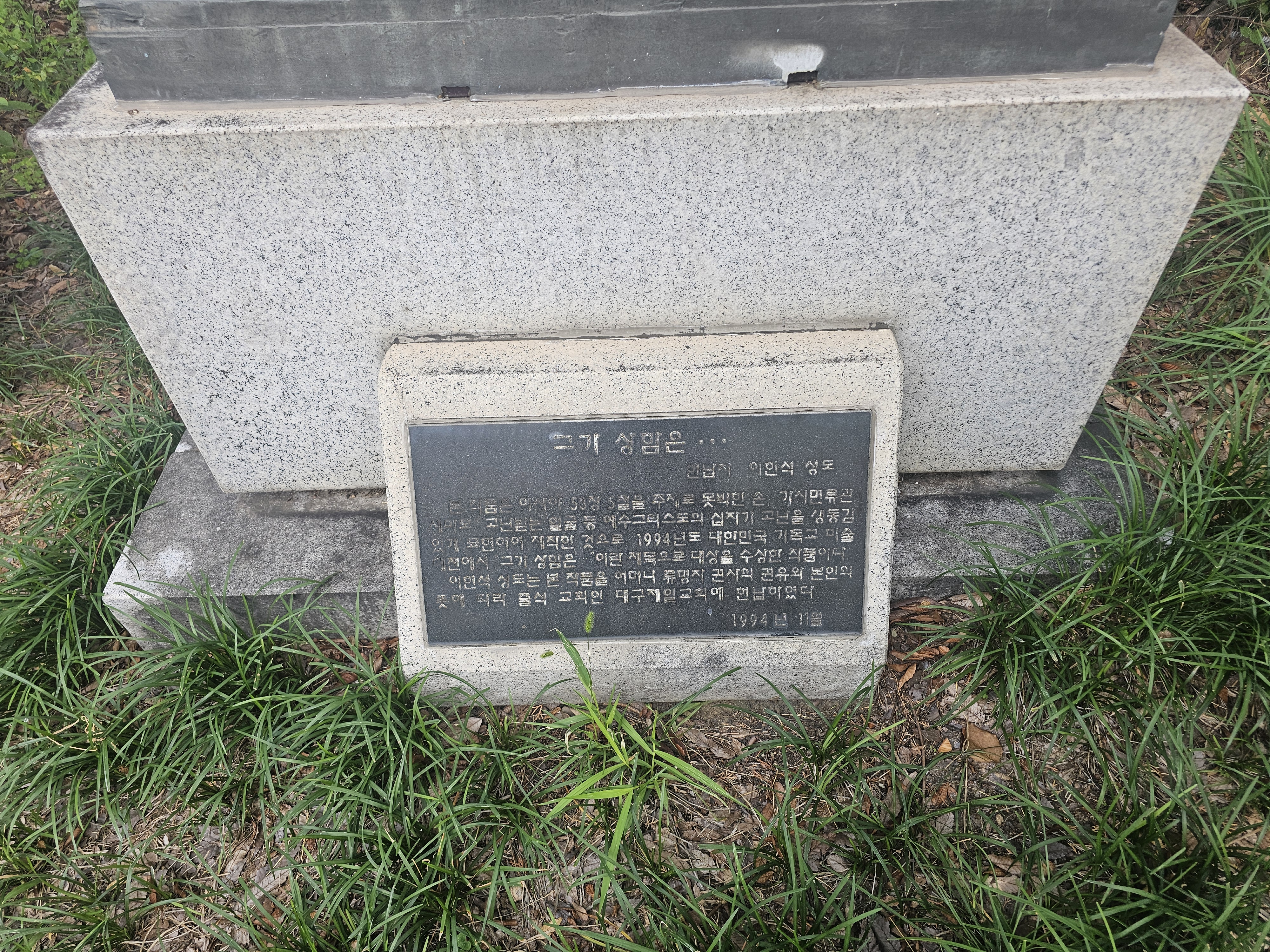 | 본 작품은 <이사야> 53장 5절을 주제로 못박힌 손 가시면류관, 세마포, 고난받는 얼굴 등 예수그리스도의 십자가 고난을 생동감있게 표현하여 제작한 것으로 1994년도 대한민국 기독교 미술대전에서 <그가 상함은...>이란 제목으로 대상을 수상한 작품이다. 이현석 성도는 본 작품을 어머니 류명자 권사의 권유와 본인의 뜻에 따라 출석 교회인 대구제일교회에 헌납하였다. |