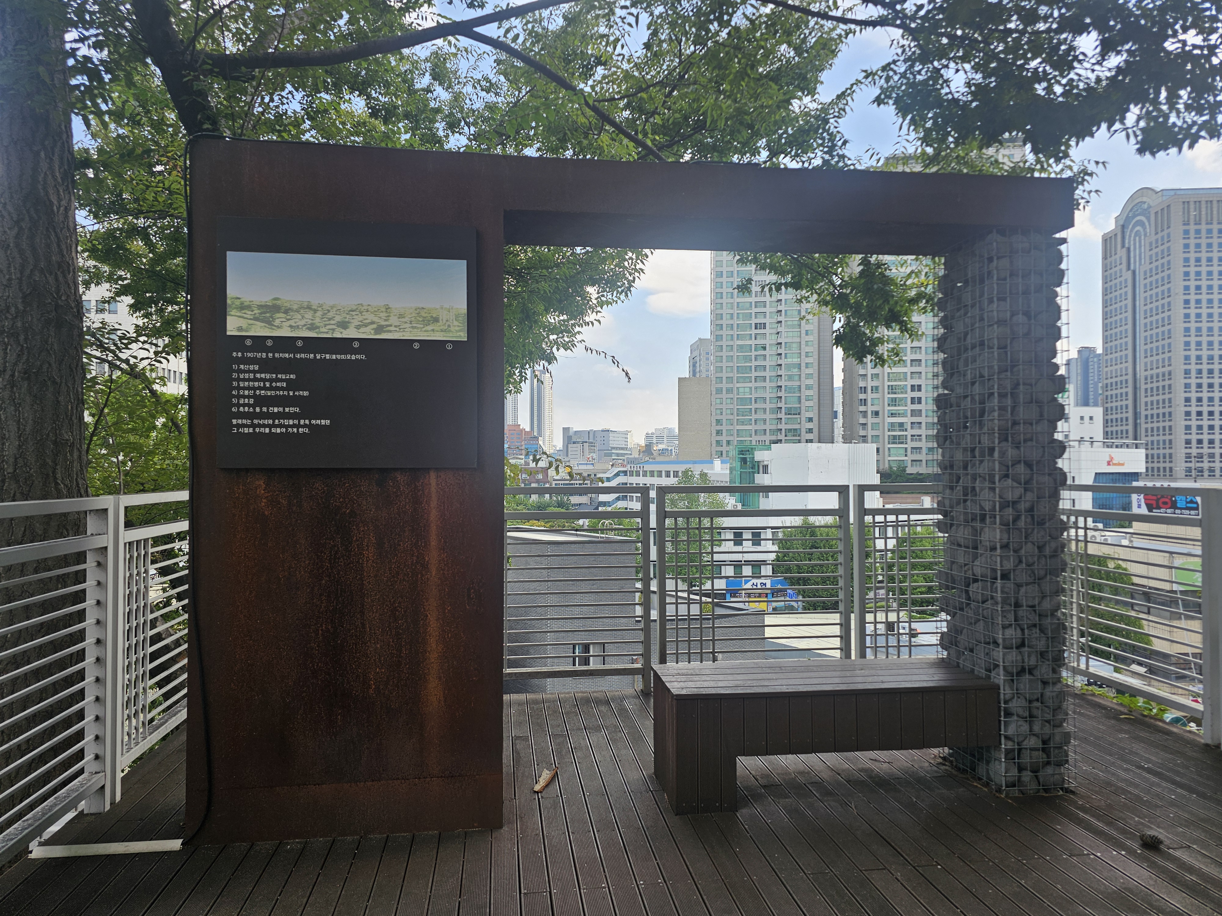 그 옆에 주후 1907년경(서기 1907년) 이 청라언덕에서 내려다본 달구벌의 모습을 담은 사진과 그 풍경을 볼 수 있는 작은 전망대가 보입니다. 정말 바로 앞에 계산성당이 보이더라고요. 그 외에도 한 때 이곳 언덕에선 남성정 예배당((구) 대구제일교회), 일본헌병대 및 수비대, 오봉산 주변(일인거주지 및 사격장), 금호강, 측후소 등의 건물이 보였다고 합니다.