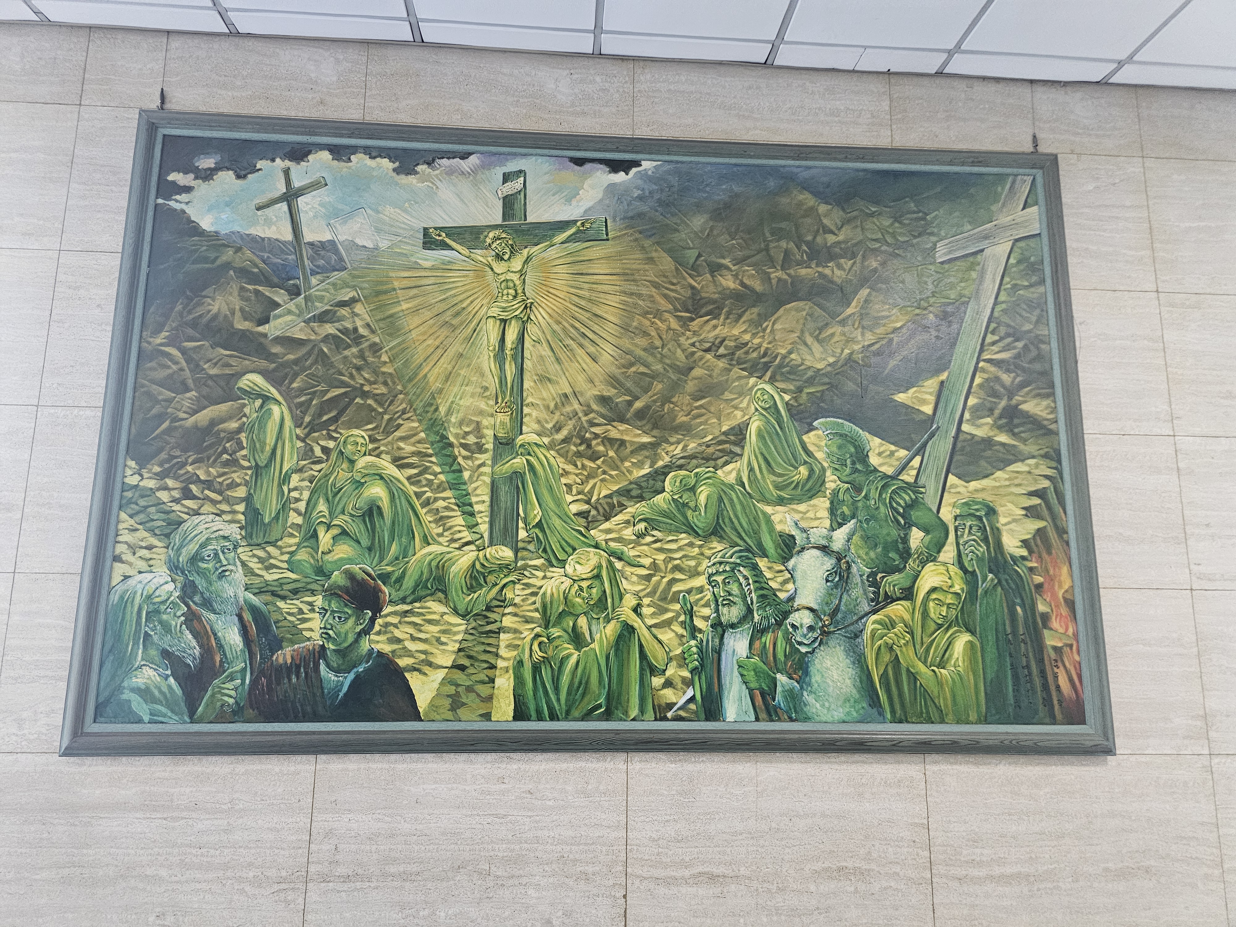 안에 들어가도 되는지 허락을 받고 들어갔습니다. 방문객은 본당 내 줄이 쳐진 곳까지만 갈 수 있다고 하더군요. 본당에 처음 들어가면 거대한 십자가에 매달린 예수님의 모습을 그린 그림이 있습니다. 그 뒤로 거대한 문이 또 신자들을 맞이합니다. 열려 있는 오른쪽 문으로 들어갑니다.