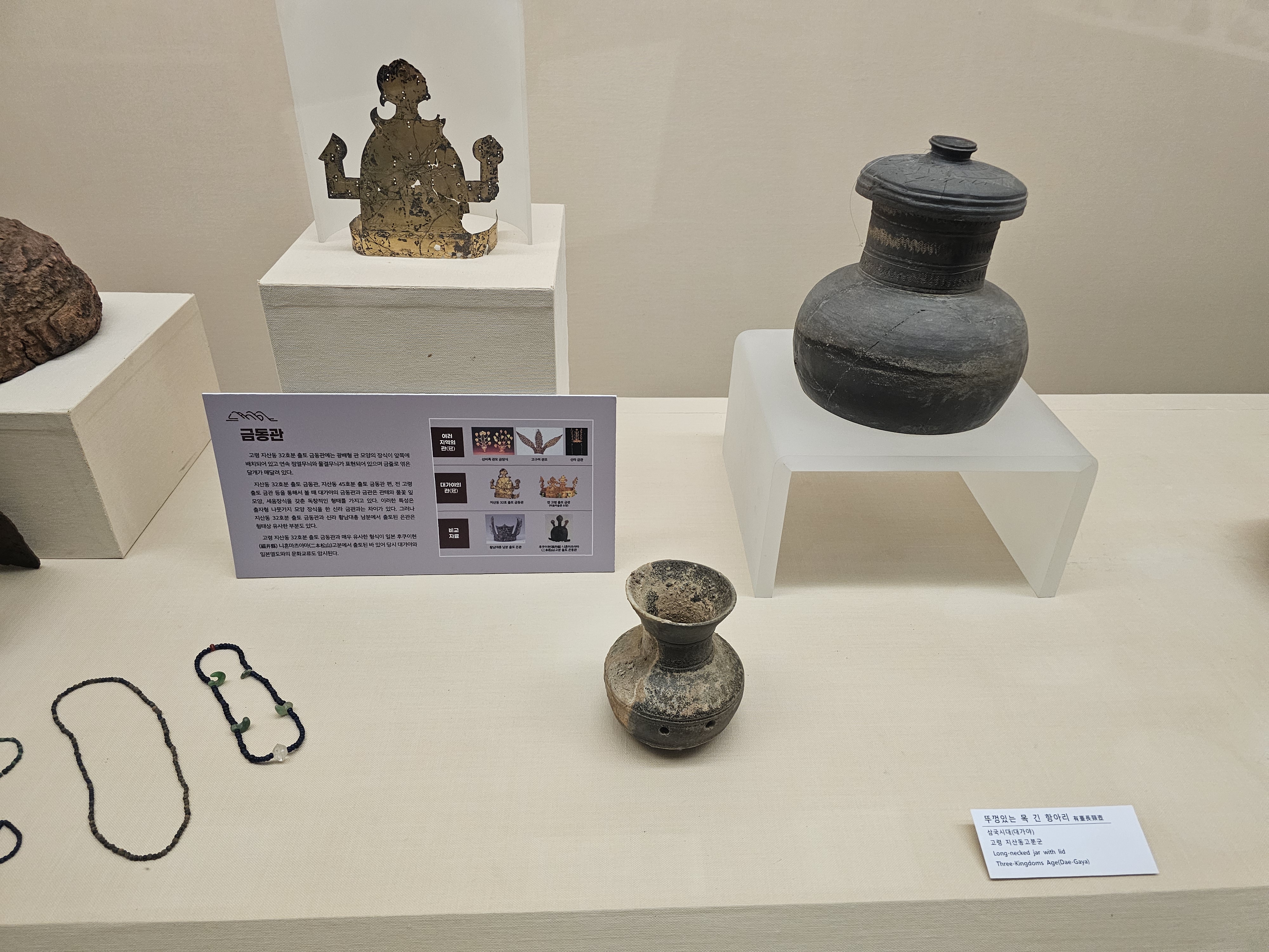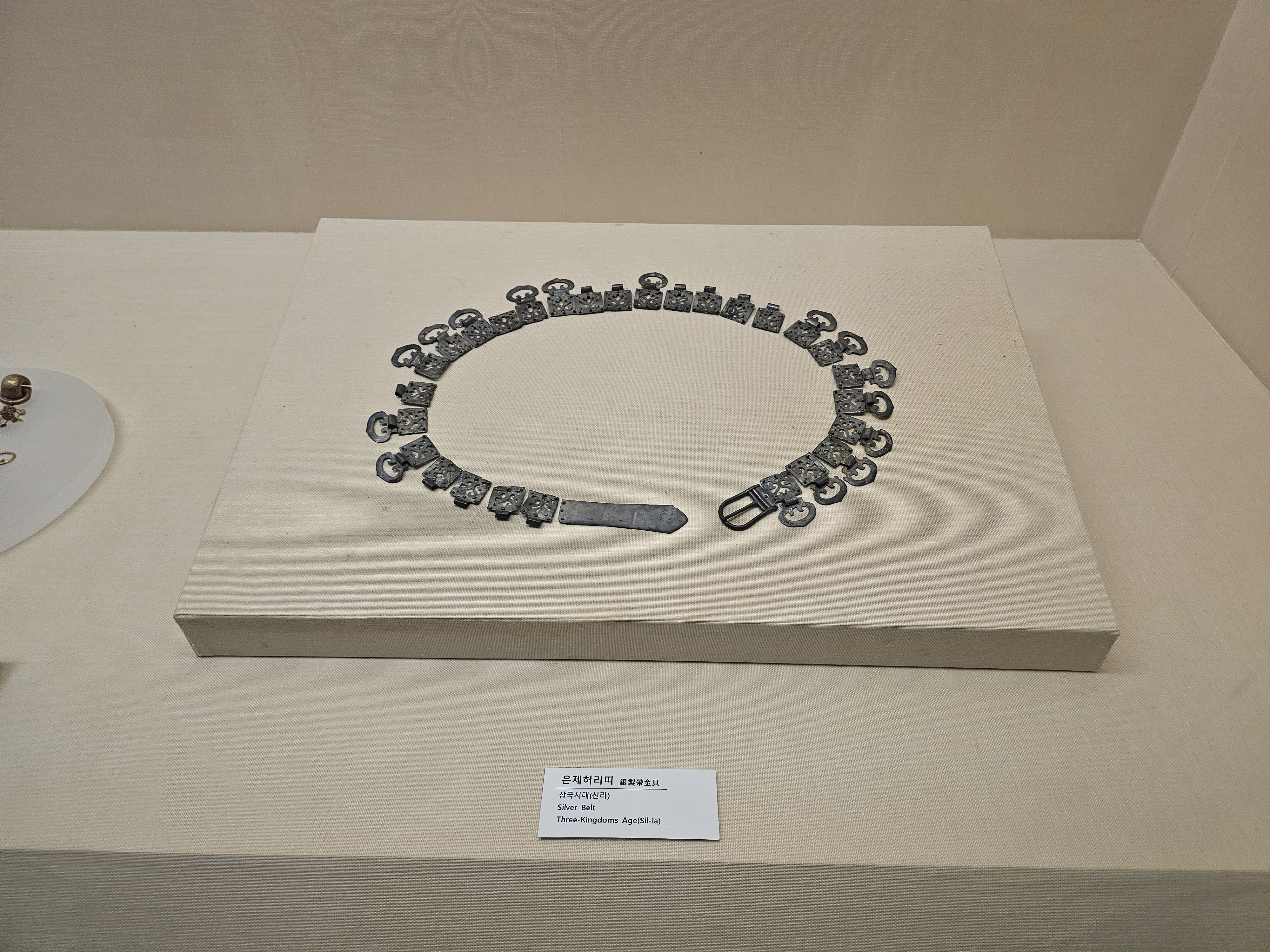 이곳에서는 신라의 금제귀걸이(금귀걸이)와 은제허리띠를 살펴볼 수 있습니다.
