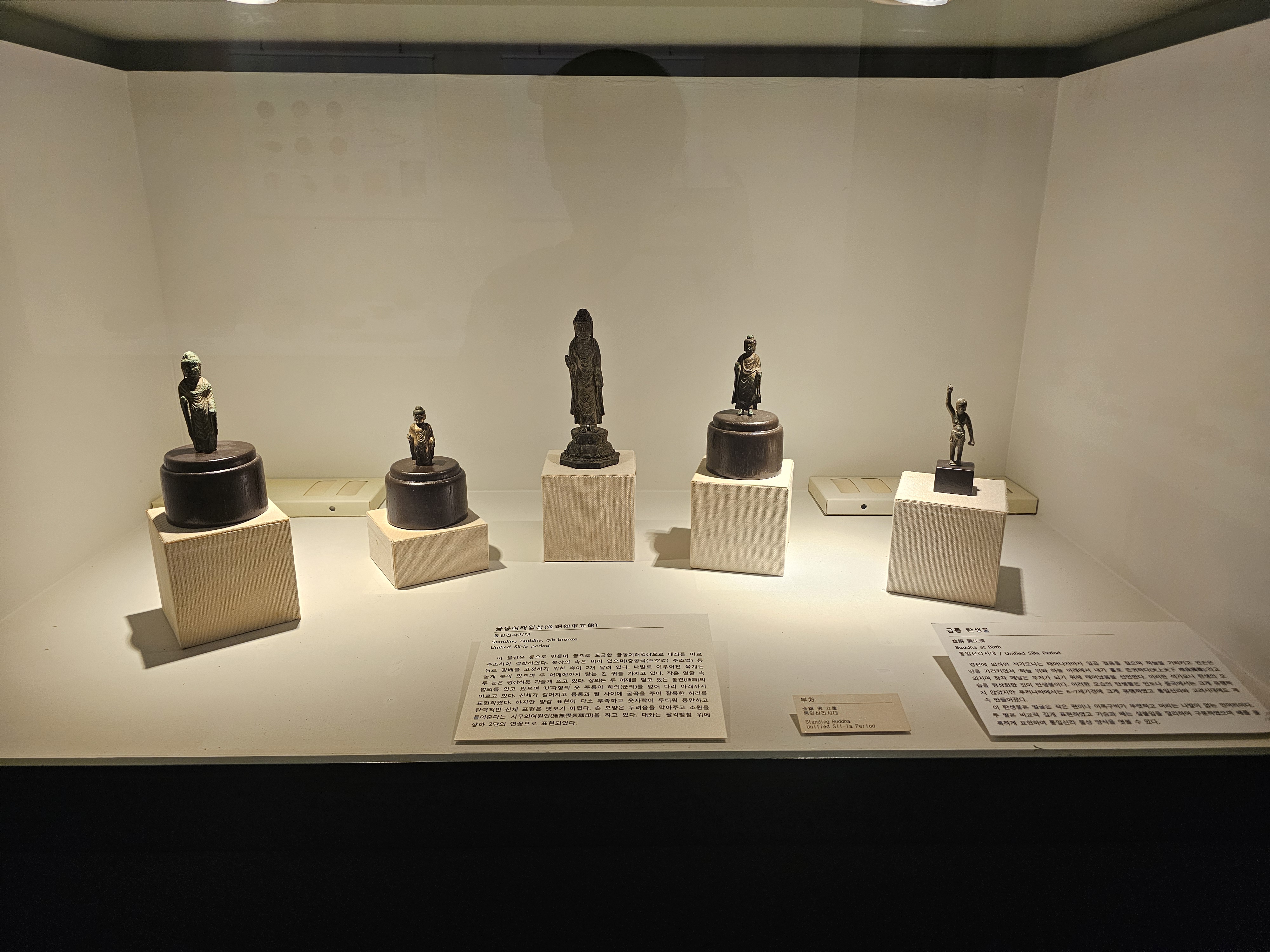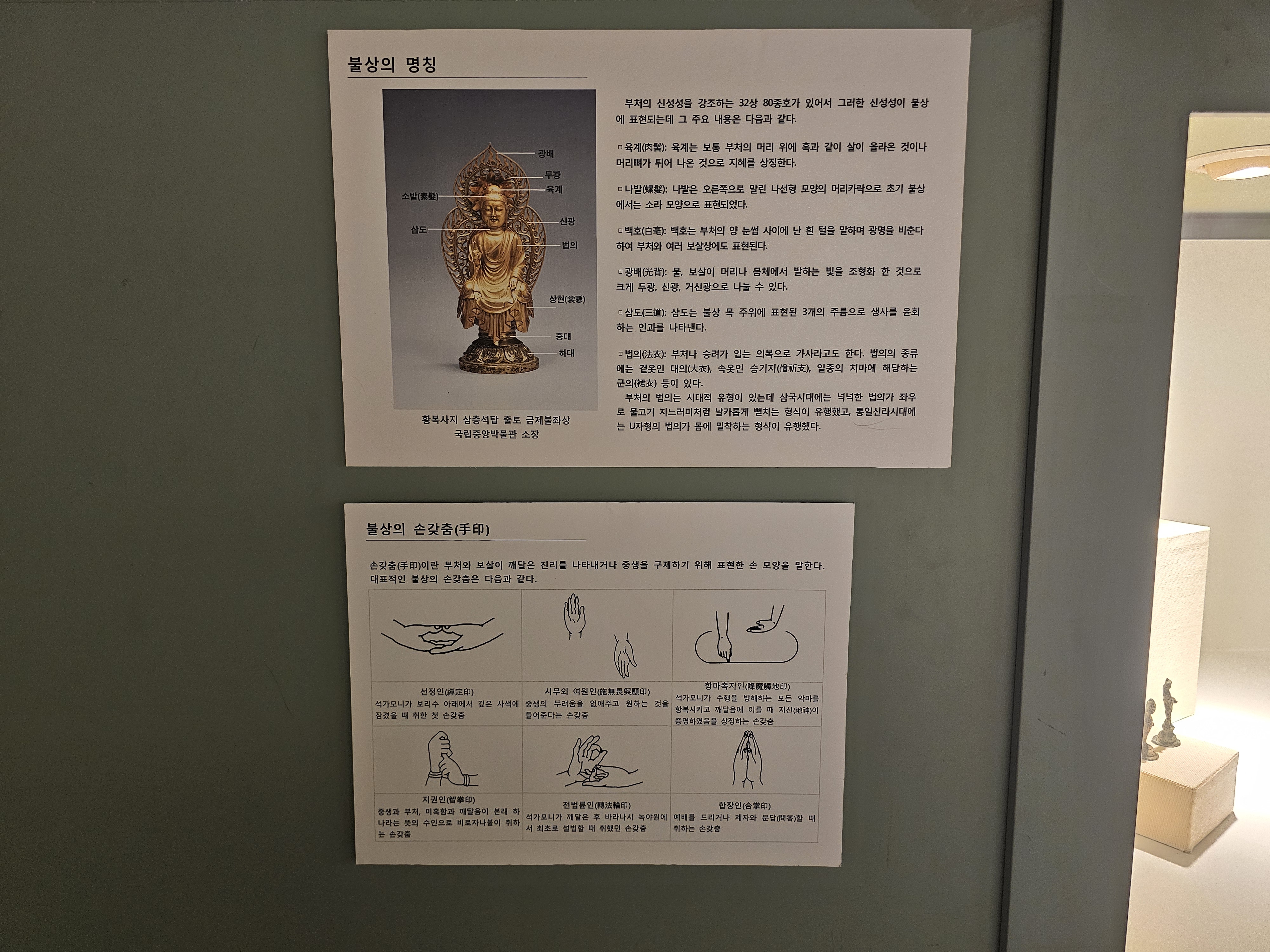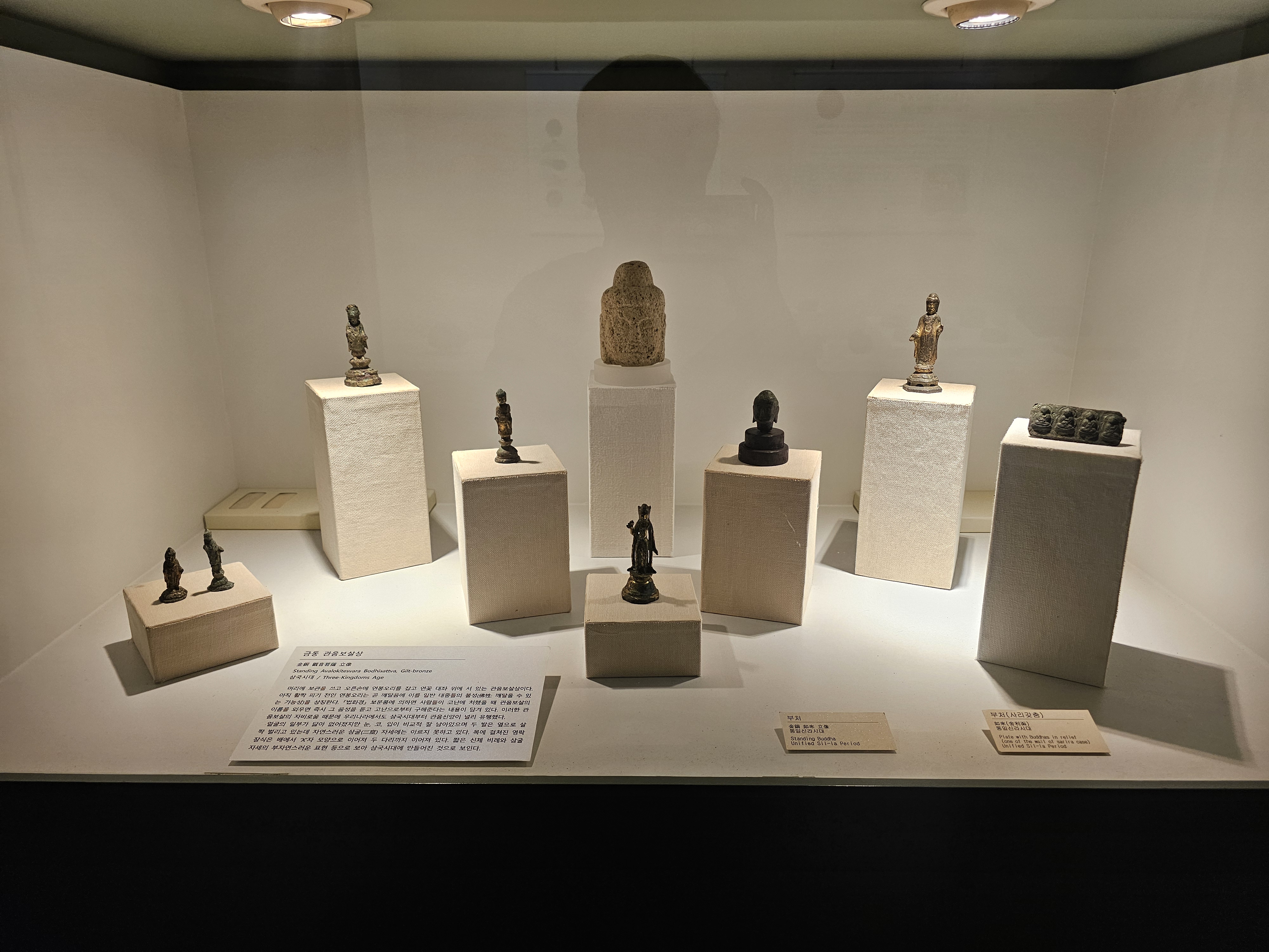 마지막으로 통일신라시대의 불교조각을 볼 수 있었습니다. 고구려, 백제, 인도 및 중앙아시아의 영향으로 발전한 당의 조각 양식을 받아들여 국제적이면서 독자적인 통일신라 조각양식을 탄생시킵니다. 초기에는 신체의 굴곡과 양감이 뚜렷한 세련되고 이상적인 형태를 띄다가, 점차 항마촉지인(마왕을 굴복시키고 깨달음을 얻었을 때, 그 증거로 지신에게 증명하며 땅을 손가락으로 가리킨 수인)의 형태의 앉은 형태의 불상이 유행합니다. 통일신라 후기로 갈수록 지방 호족의 성장과 선종(禪宗)의 영향으로 독자적인 양식의 불교조각이 확산되며 항마촉지인 불상, 약사불, 비로자나불의 형태가 유행하게 되었다고 하네요.