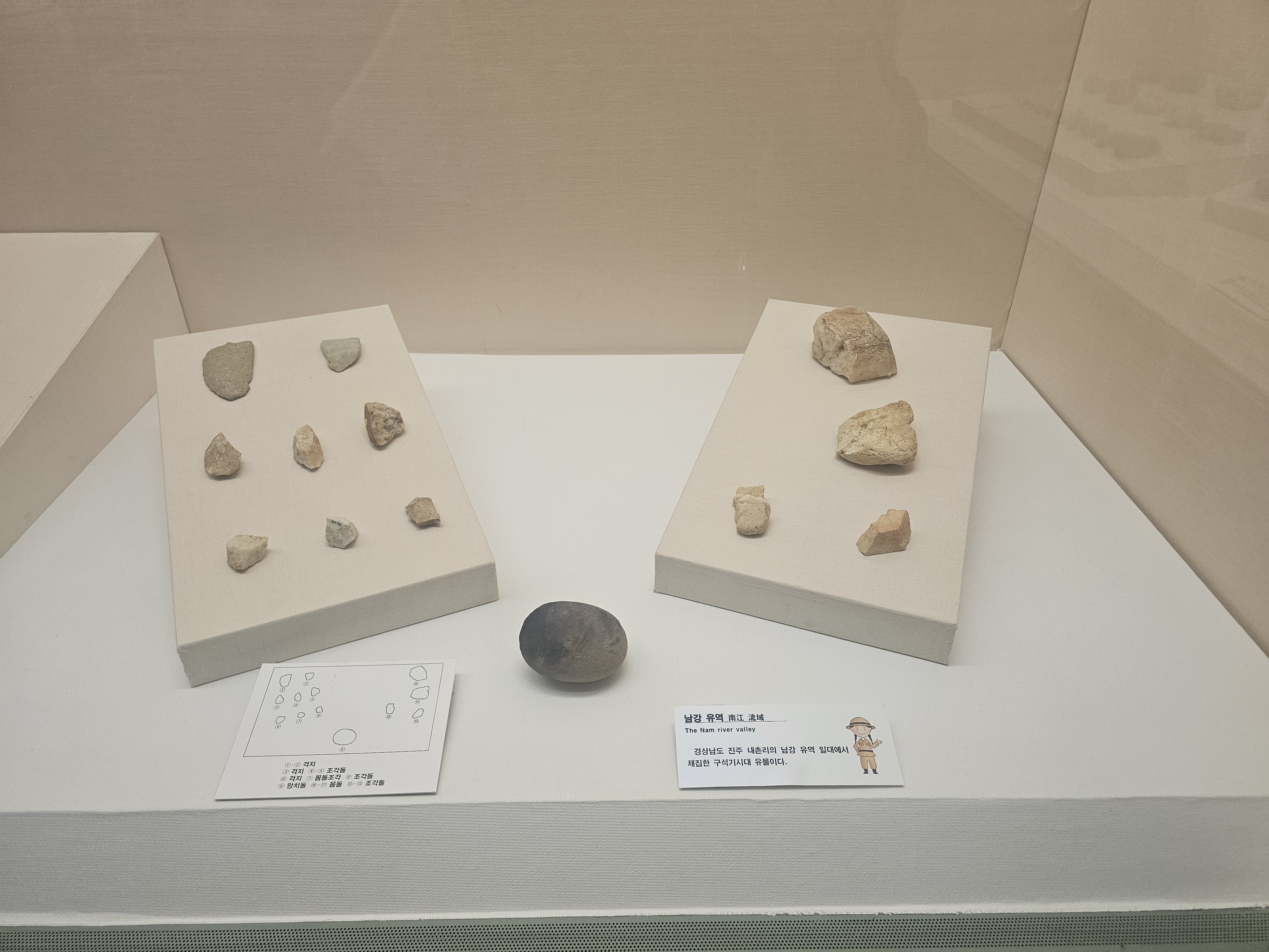임진강과 한탄강 유역 일대, 경남 진주 내촌리의 남강 유역, 낙동강 유역(관화리와 취곡리), 섬진강과 보성강 유역에서 채집된 구석기시대 유물들을 볼 수 있습니다.
