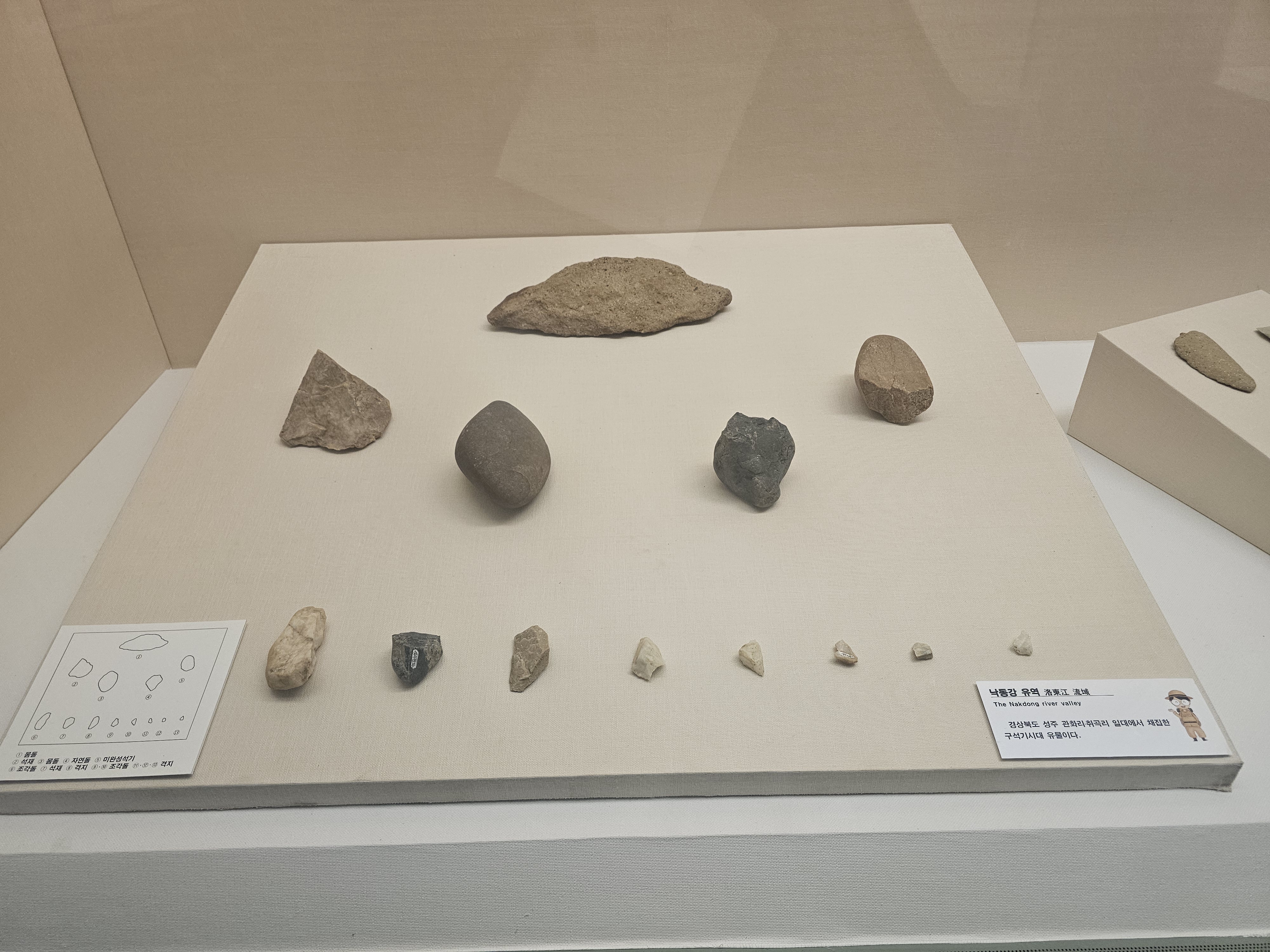 소규모 무리 이동 생활을 하며 사냥과 채집, 어로활동으로 생계를 유지한 구석기시대의 유물을 처음 볼 수 있습니다. 이 시기에는 동굴, 바위그늘, 강가나 평지에서 임시적으로 지냈으며, 주먹도끼, 돌날자르개, 돌날긁개, 돌날새기개 등을 썼다고 합니다.