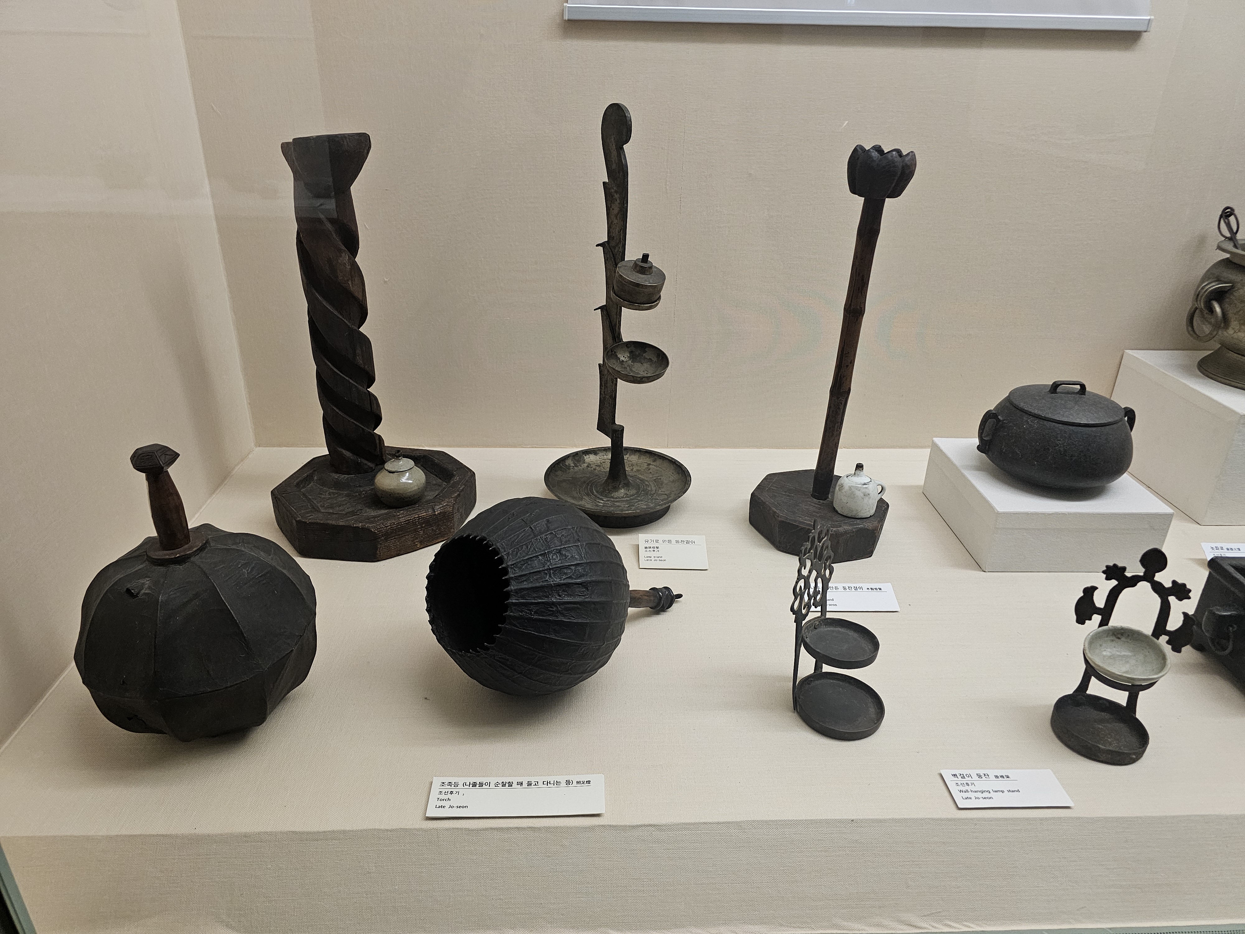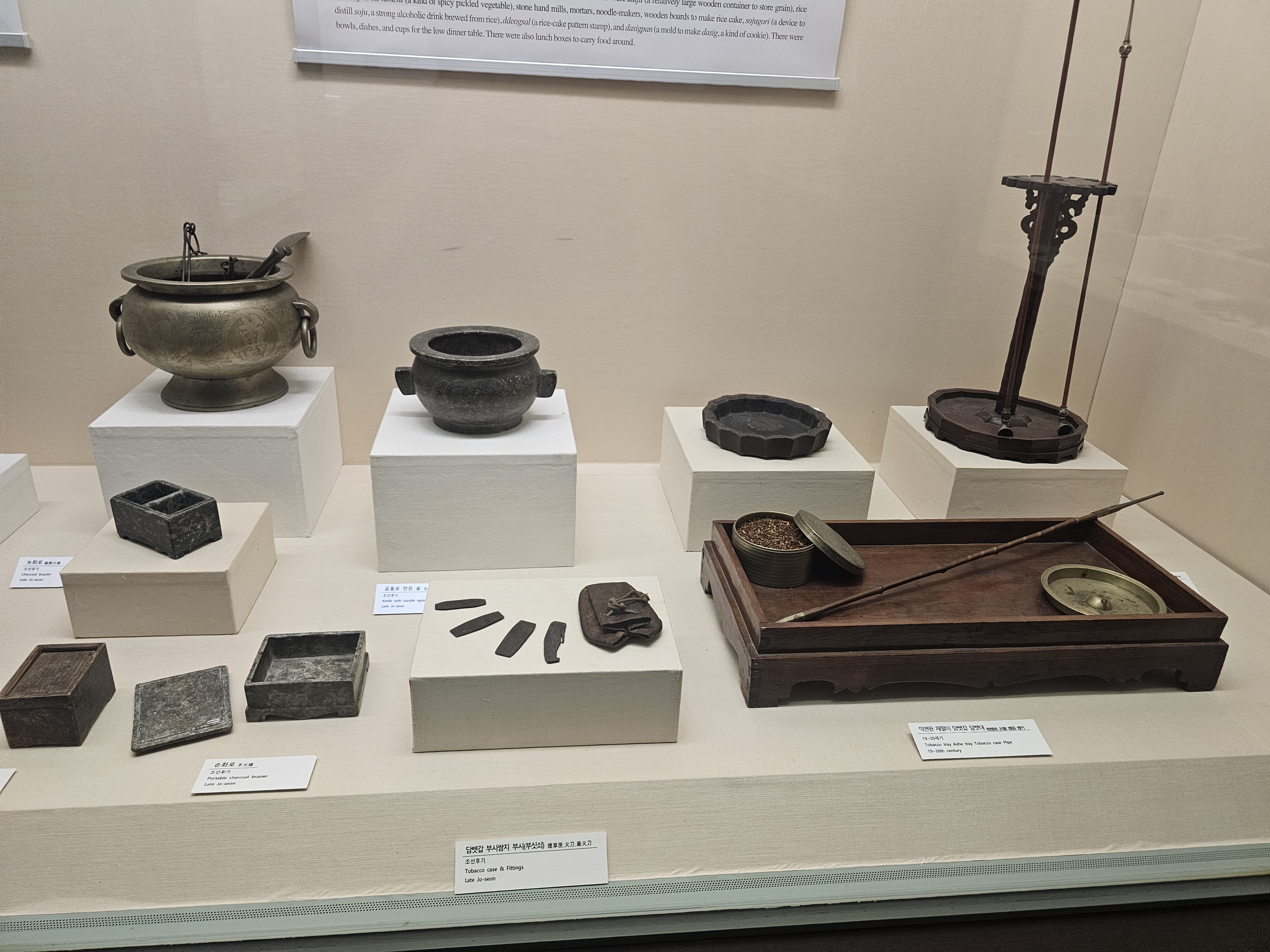 조선의 일상생활유물도 빼놓을 순 없죠! 조족등(照足燈, 불빛이 발밑을 비추도록 만들어진 등), 등잔걸이, 벽걸이 등잔, 담뱃갑, 부시쌈지, 부시(부싯쇠), 솥, 놋화로, 손화로, 담뱃대 등 다양한 검소하고 친환경적인 생활용품들도 만나볼 수 있습니다.