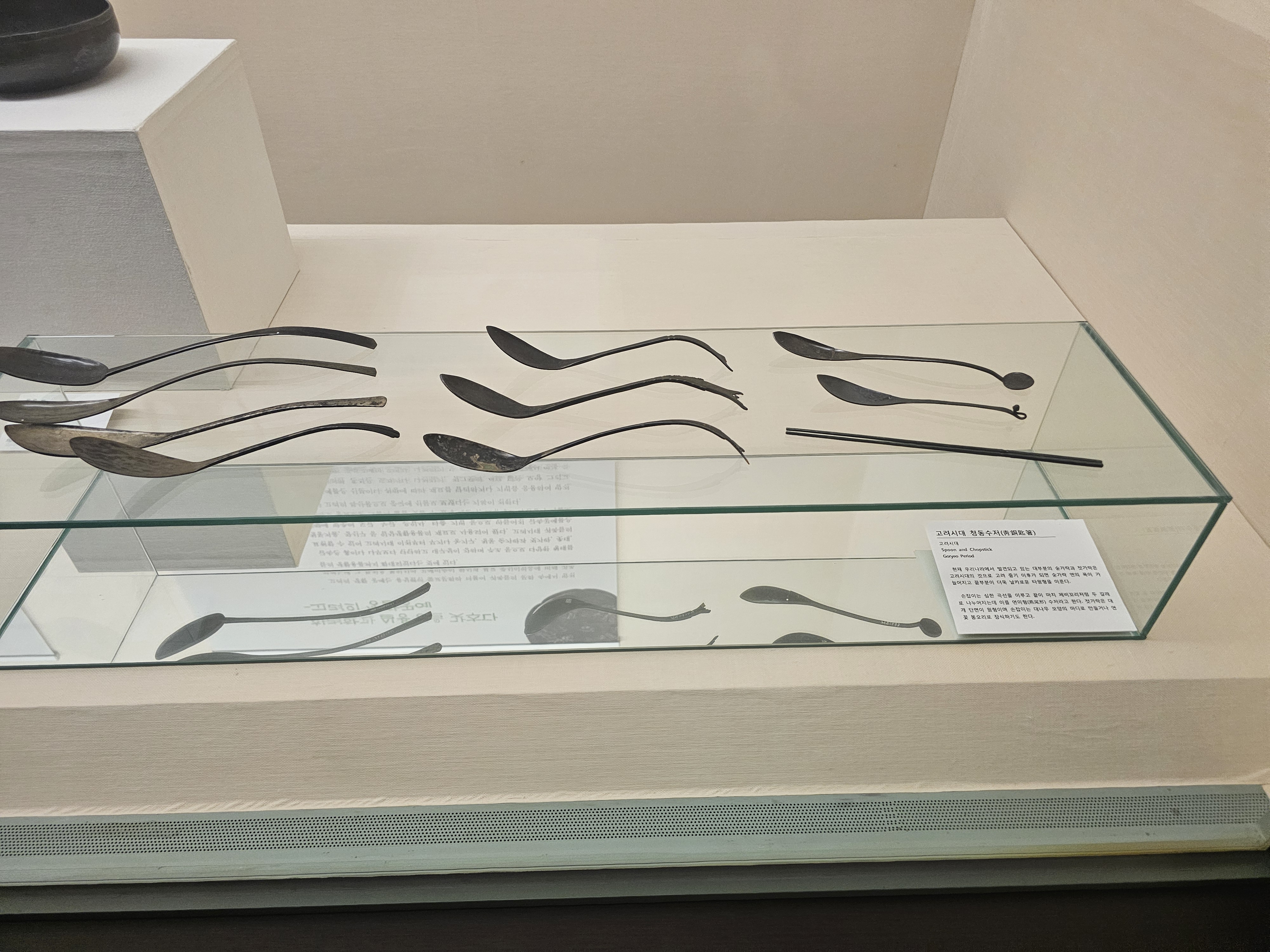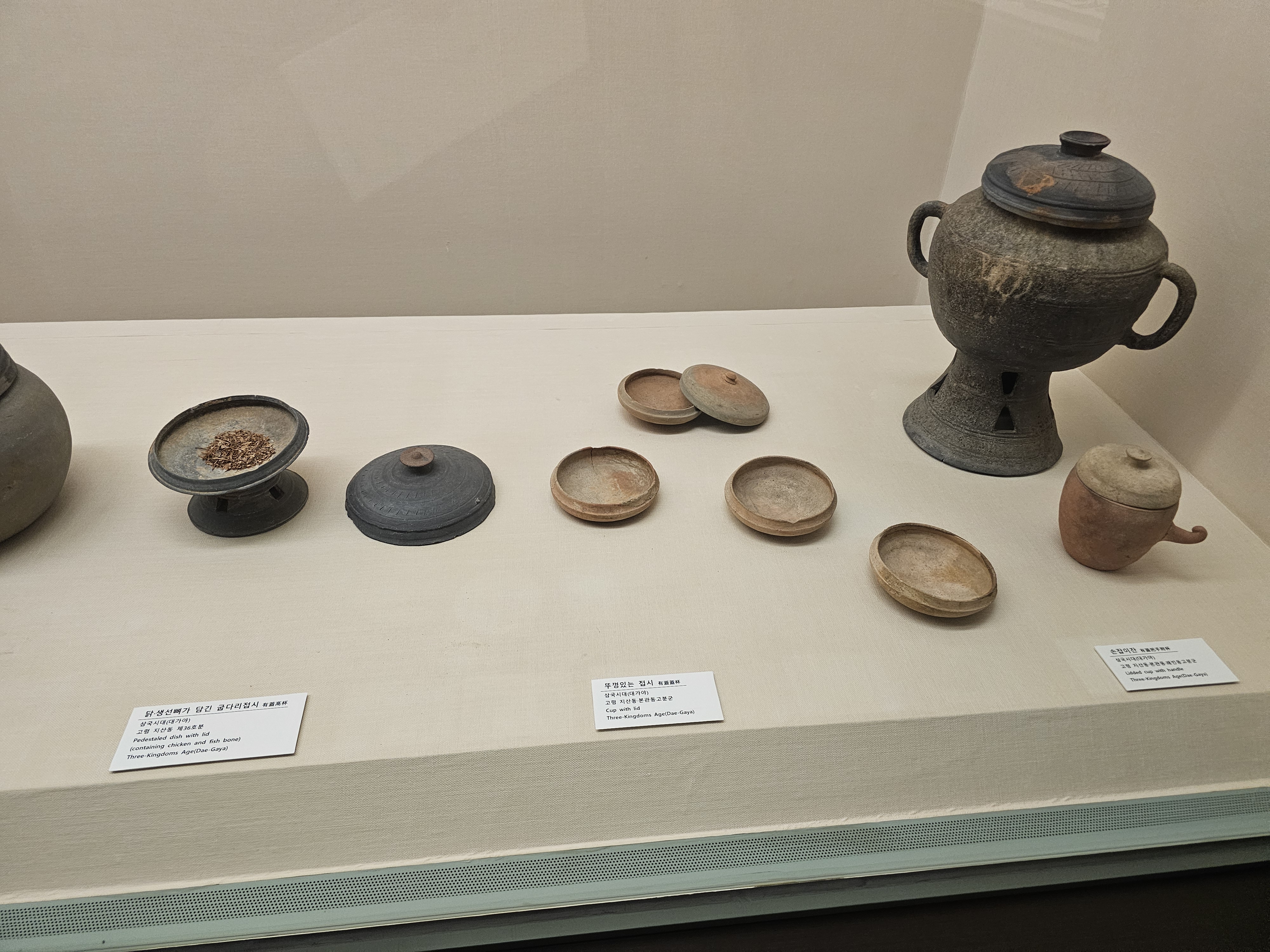 고령에서 발굴된 굽다리접시, 뚜껑있는 접시, 손잡이잔입니다. 땅이 비옥해서 농사 짓기 좋았던 이곳에서 밭을 갈아 곡식을 먹었는데, 오곡(쌀, 조, 콩, 기장, 보리)과 복숭아 등의 과일이나 채소, 고둥, 생선, 닭도 먹었음을 확인했습니다. 그릇이나 음식 등을 봤을 때, 이 때에도 음식은 식용과 제사용으로 쓰였다고 추측하기도 합니다.
