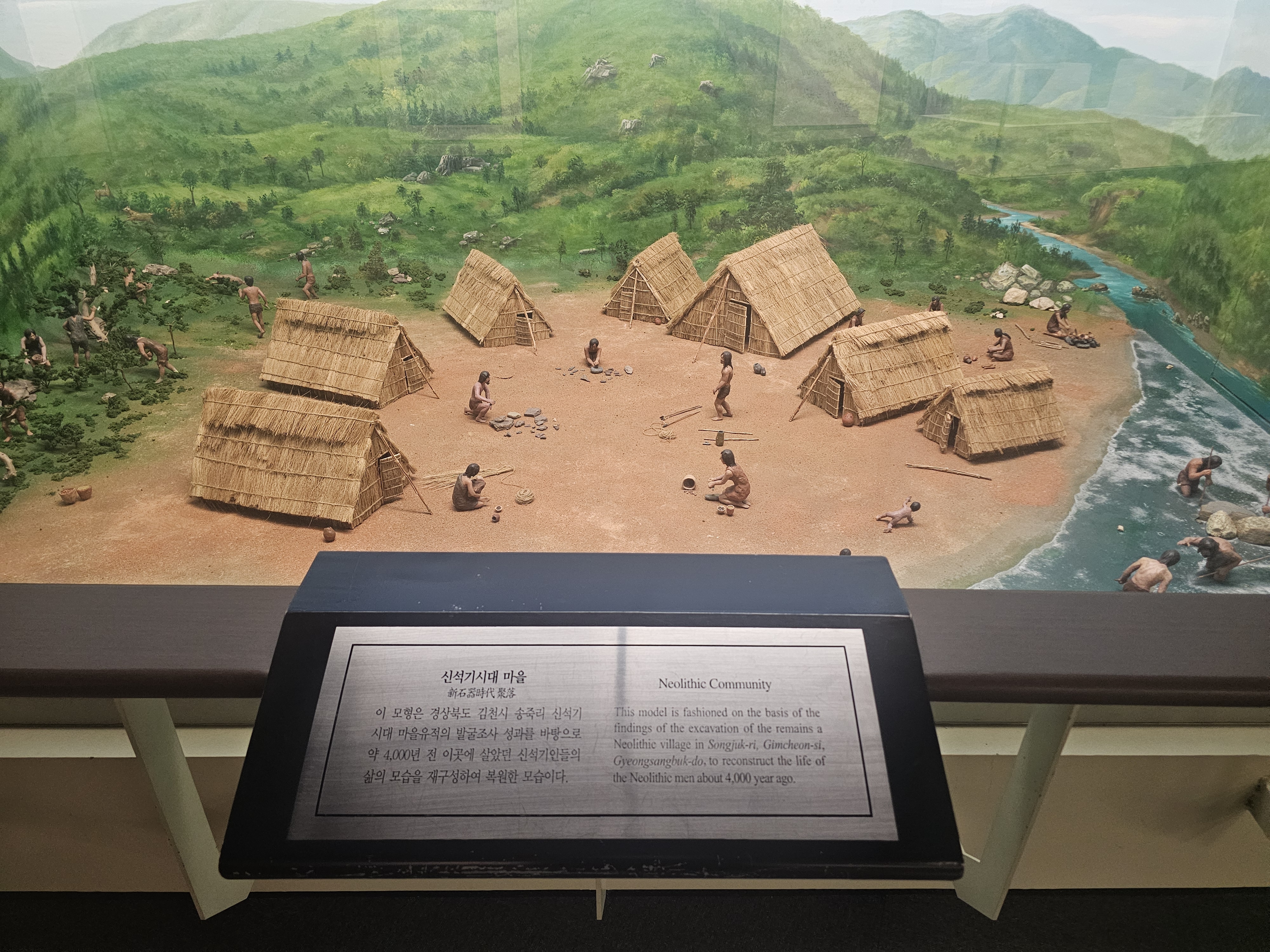 경상북도 김천시 송죽리 신석기시대 마을 유적의 발굴 조사 성과를 바탕으로 약 4000년 전 이곳에 살았던 신석기인들의 삶의 모습을 재구성하여 복원한 마을 모습을 볼 수 있습니다. 이런 신석기시대 마을은 일반적으로 반정주성 형태의 소규모 마을이 점차 정주마을로 되다가 마을의 규모가 축소되어 가는 형태를 띱니다. 물론 이례적으로 파주 대능리 유적이나 서해안 도서지역을 통해 마을의 규모가 줄어들지 않는 형태도 볼 수 있죠.