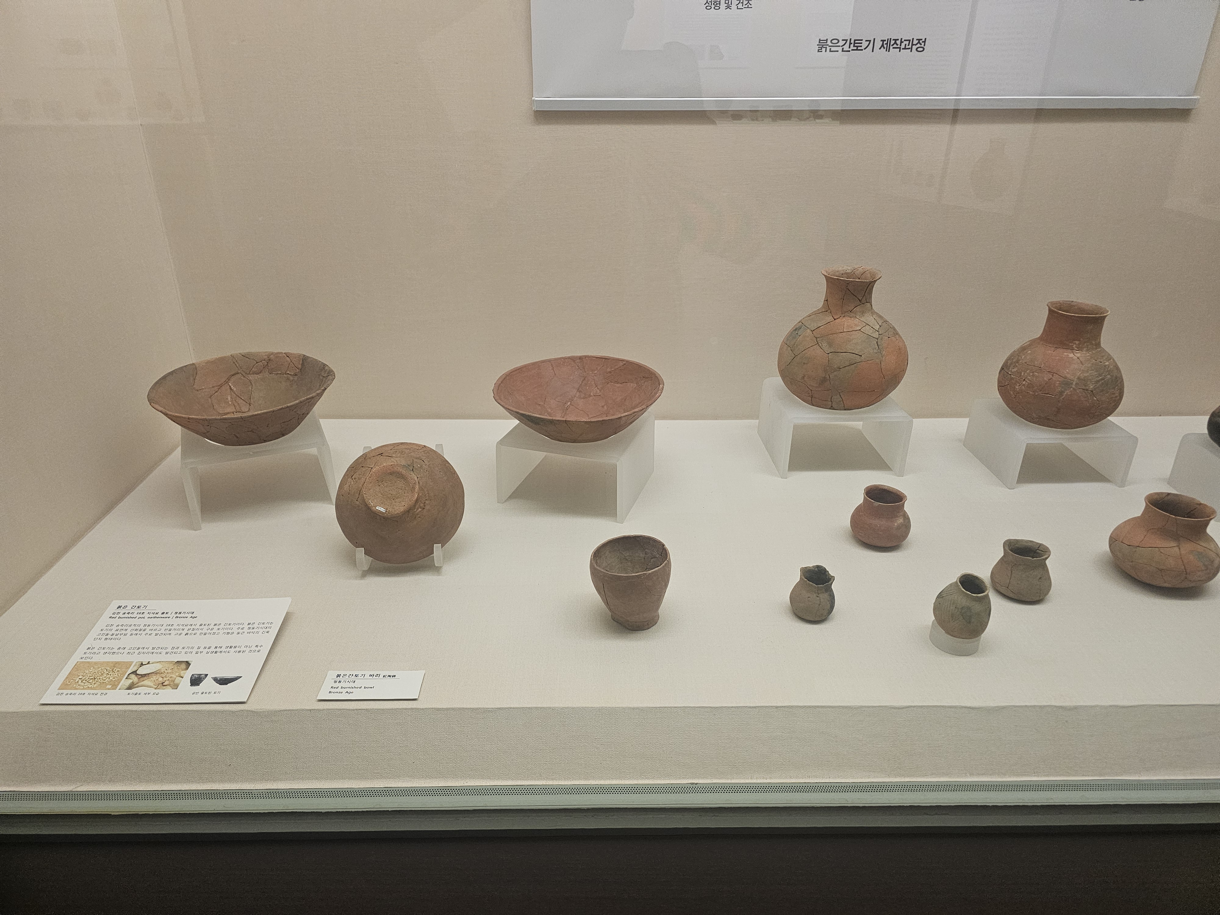 토기의 표면에 산화철을 바르고 반들거리게 문질러서 구운 붉은 간토기는 주로 고인돌이나 돌널무덤 등 무덤 내에서 주로 발견되며, 고운 흙으로 만들어졌고, 토기의 형태는 둥근 바닥의 긴목 단지 형태입니다. 이 붉은 간토기도 송죽리 유적에서 발굴되었다고 합니다.