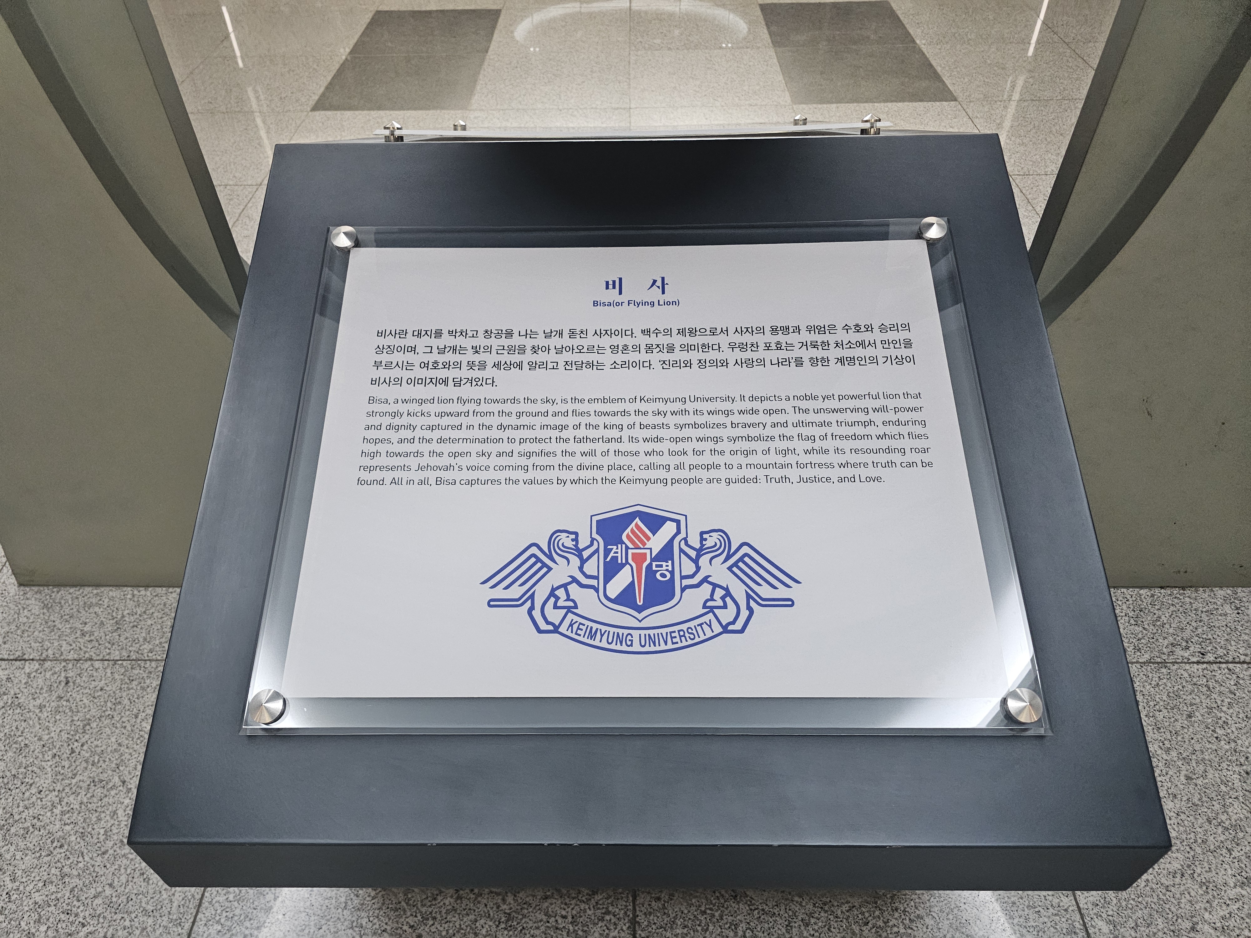 이 종탑 위의 비사(飛獅, Flying Lion)는 계명대학교의 상징이죠. 용맹과 위엄을 떨치며 수호와 승리의 상징인 백수의 제왕 사자가 빛의 근원을 찾아 날아오르는 영혼의 몸짓을 표현한 날개가 달려 있는 모습으로, 진리와 정의와 사랑의 나라로 비상하는 계명인의 기상을 묘사했다고 합니다.
