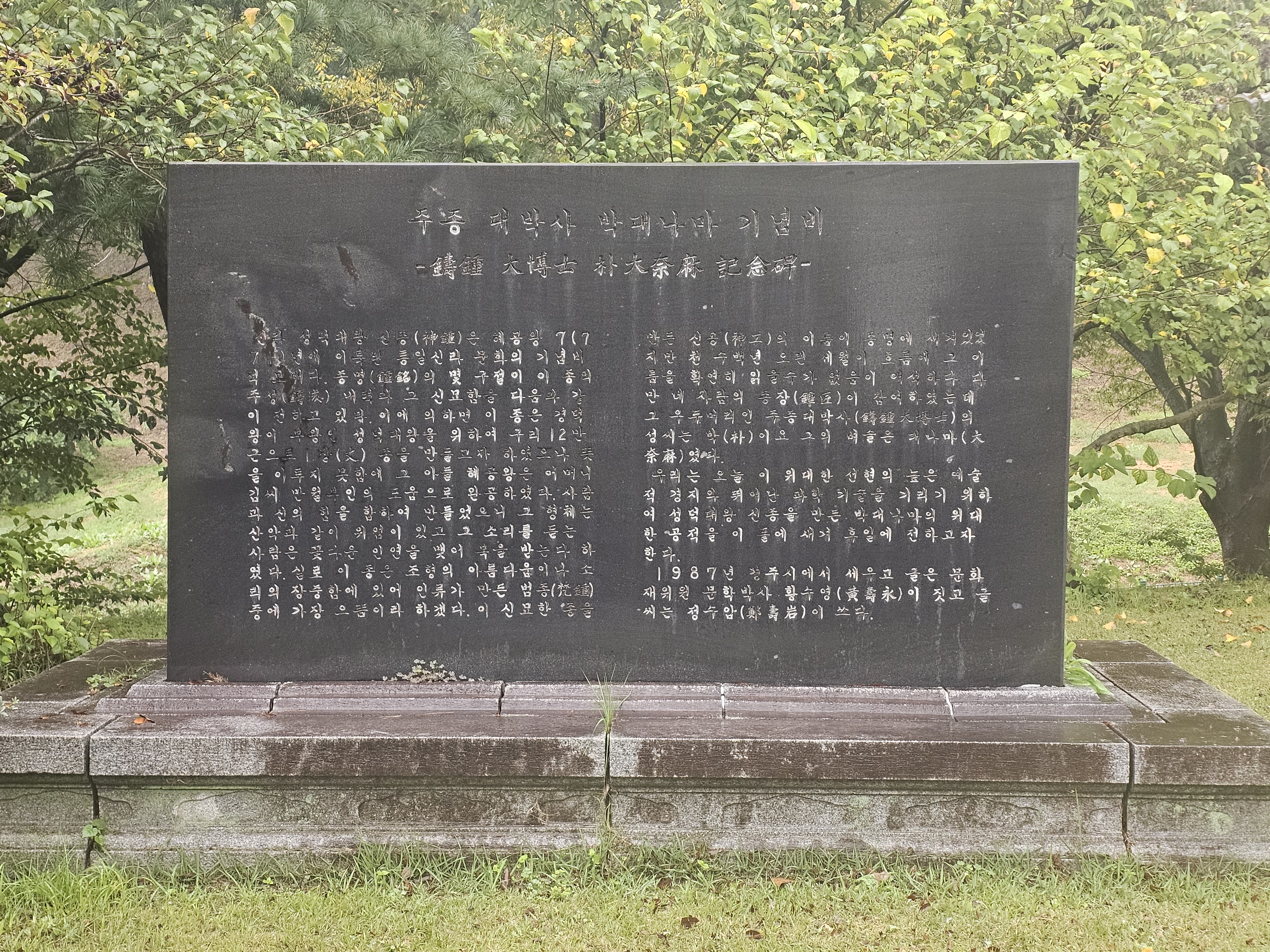 | 신라 성덕대왕 신종(神鐘)은 혜공왕 7년(771년)에 이룩한 통일신라 문화의 기념비적 보배다. 종명(鐘銘, 종에 새긴 명)의 몇 구절이 이 종의 주성(鑄成, 녹인 쇠붙이를 거푸집에 부어 물건을 만듦) 내력과 그 신묘함을 다음과 같이 전하고 있다. 이에 의하면 이 종은 경덕왕이 부왕인 성덕대왕을 위하여 구리 12만근으로 1장(丈) 종을 만들고자 하였으나 뜻을 이루지 못함에 그 아들 헤공왕은 어머니 김씨 만월부인의 도움으로 완공하였다. 사람과 신의 힘을 합하여 만들었으니 그 형체는 산악과 같이 위엄이 있고 그 소리를 듣는 사람은 꽃다운 인연을 맺어 복을 받는다 하였다. 실로 이 종은 조형의 아름다움이나 소리의 장중함에 있어 인류가 만든 범종(梵鐘) 중에 가장 으뜸이라 하겠다. 이 신묘한 종을 만든 신공(神工)의 이름이 종명에 새겨있었지만 천 수백년 오랜 세월이 흐름에 그 이름을 확연히 읽을 수가 없음이 애석하다. 다만 네 사람의 종장(鐘匠)이 참여하였는데 그 우두머리인 주종대박사(鑄鐘大博士)의 성씨는 박(朴)이요 그의 벼슬은 대나마(大奈麻)였다. 우리는 오늘 이 위대한 선현의 높은 예술적 경지와 뛰어난 과학 기술을 기리기 위하여 성덕대왕 신종을 만든 박대나마의 위대한 공적을 이 돌에 새겨 후일에 전하고자 한다. 1987년 경주시에서 세우고 글은 문화재위원 문학박사 황수영(黃壽永)이 짓고 글씨는 정수암(鄭壽岩)이 쓰다. |