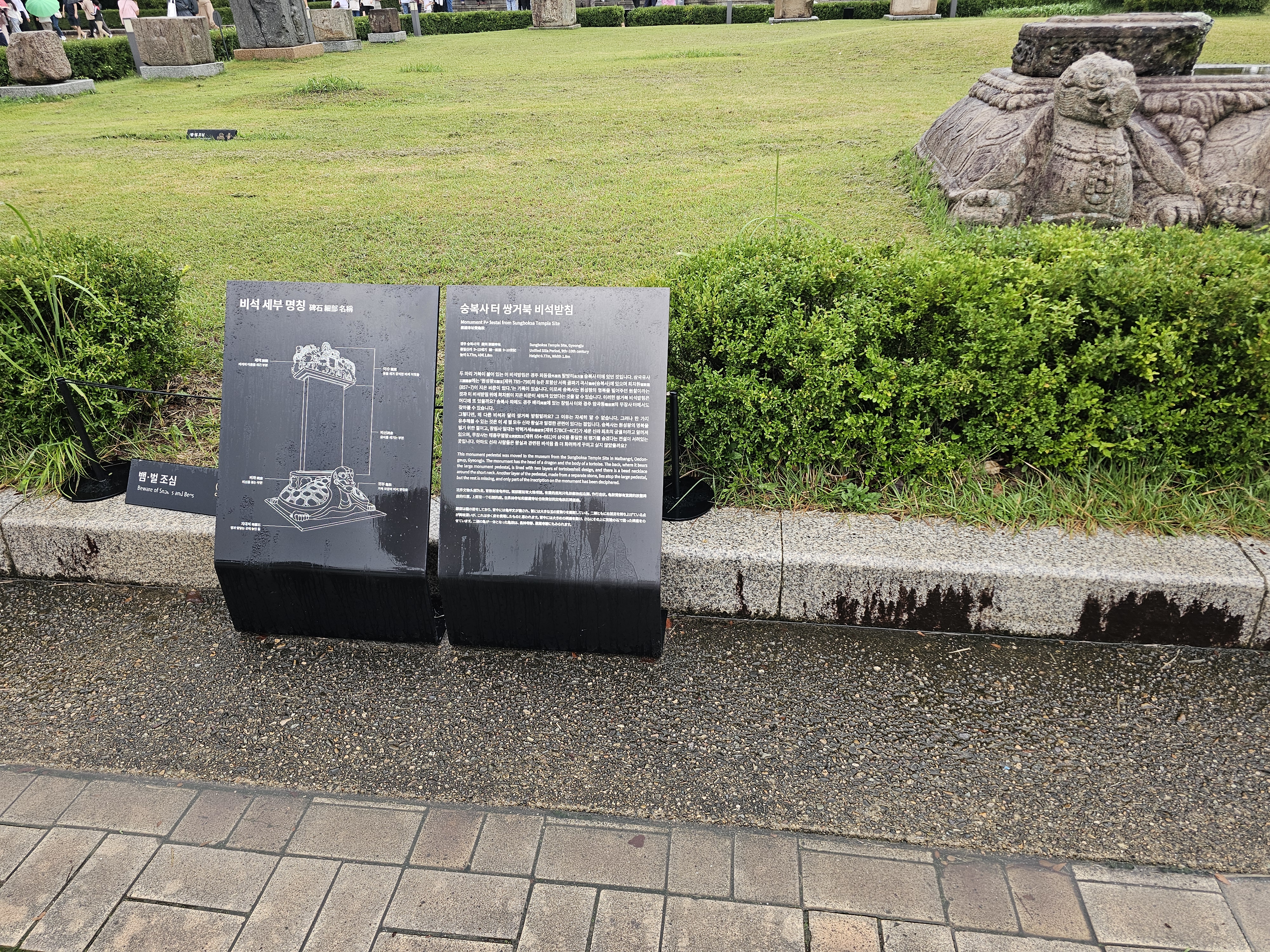 이 절에서 9-10세기에 지어진 것으로 추정되는 높이 0.77m, 너비 1.8m 규모의 숭복사터 쌍거북 비석받침입니다. 지금은 국립경주박물관으로 옮겨져있죠. 이 비석받침의 특징은 꽤 희귀한 형태의 쌍거북 형태로 지어졌다는 것이죠. 안내문에 따르면, 이런 형태는 창림사지 쌍귀부, 무장사지 쌍귀부 등 신라시대 국가 중요 사찰에서 주로 발견되는 형태이기 때문에 신라 왕실과 관련된 비석의 귀부라고 추정됩니다.