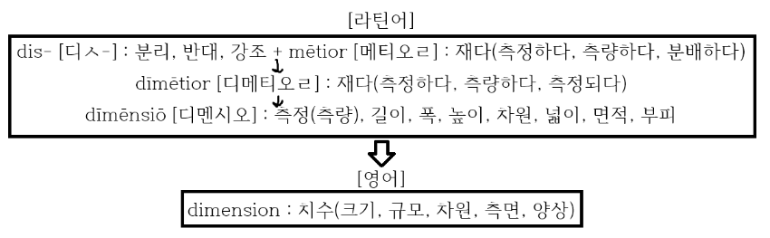 라틴어로 '나누어(dīs-) 재다(mētior)'란 근본적인 뜻을 가진 동사 dīmētior[디메티오ㄹ]에서 유래한 영단어 dimension은 '나누어 잼->나누어 재는 것'이란 뜻을 거쳐 '치수(크기, 규모, 차원), 측면, 양상'이라는 뜻이 되었습니다.