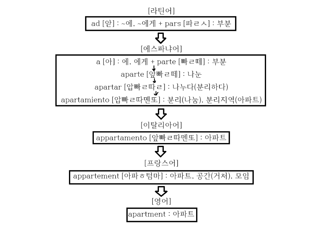 근본적으로 '~에(로)의 부분'이라는 표현에서 '나눠진 구역->(거주를 위해) 나눠진 구역'이란 뜻을 거쳐 appartment는 '아파트'라는 뜻을 가지게 됩니다.