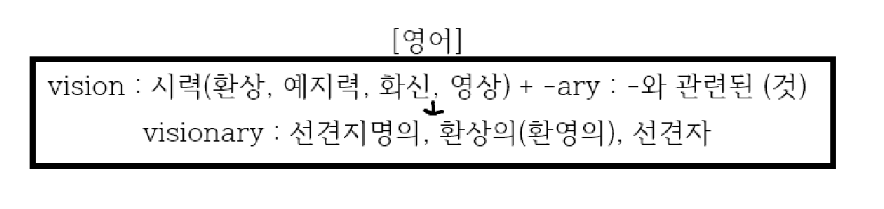 영어 단어 visionary는 '시력(환상, 예지력, 화신, 영상)'이란 뜻의 명사 vision에 '-~와 관련된'이란 뜻의 접미사가 붙어 만들어졌습니다.