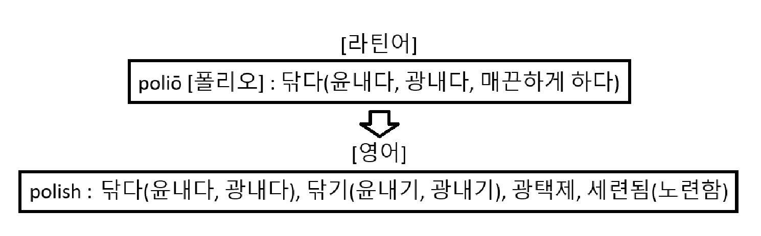 라틴어로 '닦다(윤내다, 광내다, 매끈하게 하다)'라는 뜻의 poliō [폴리오]에서 같은 뜻을 그대로 영어에서 받아들여 polish라는 단어가 나타납니다.
