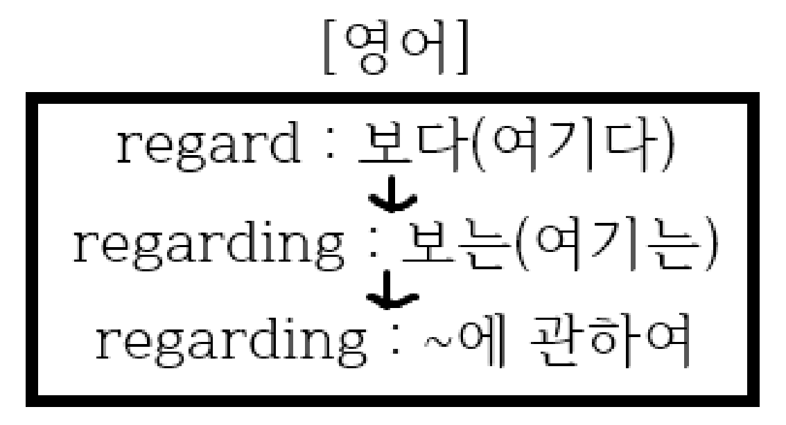 '보다(여기다)'라는 뜻의 동사 regard의 현재 분사 regarding에서 '보는(여기는)->(뒤따라 오는 단어)를 보는->'~에 관하여'라는 뜻을 거쳐 전치사 regarding이 파생되었습니다.