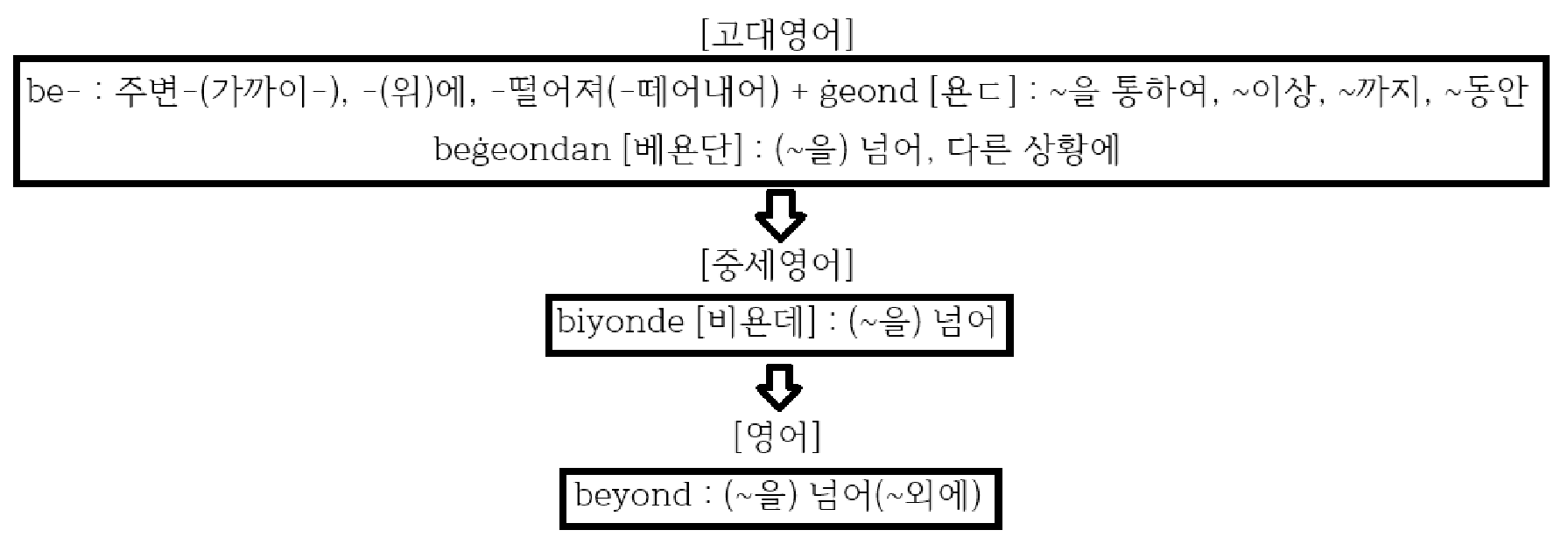 beyond는 고대영어에서 be-(~너머로) + ġeond(~을 통하여, ~지나)가 결합된 beġeondan((~을) 넘어)에서 출발해, '물리적으로 넘어가->범위나 한계를 초과해->추상적 영역(이해나 통제 등)을 벗어나'로 의미가 확장되었습니다.