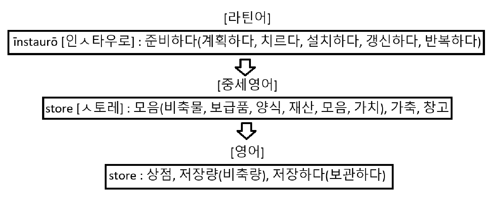 store은 어원적으로 '준비하다->제대로 갖추다->제대로 갖추어 다시 세우다->제대로 갖추어 다시 세운 것->제대로 갖추어 준비된 것->제대로 갖추어 준비되어 모인 것->교환하고 유통하기 위한 상품들이 제대로 준비되어 모인 것(상점, 비축량), 교환하고 유통하기 위한 상품들을 제대로 준비하다(저장하다, 보관하다)'라는 뜻으로 확장됩니다.