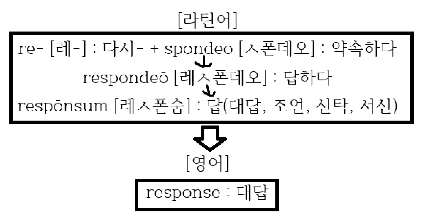 '다시 약속하다'라는 근본적인 뜻에서 '다시 약속하다->다시 말하다->(상대의 말에 대해) 답하다->답하는 것'이란 뜻을 거쳐 '대답'이라는 의미로 response가 등장합니다.