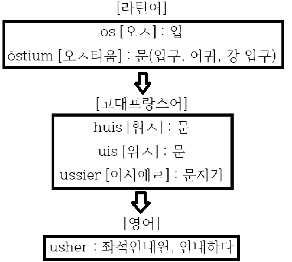 '입'이라는 뜻의 라틴어 중성명사 ōs [오ㅅ]에서 '(건물, 강 등의) 입->문'이란 뜻의 ōstium [오ㅅ티움]이 등장합니다. 이 단어는 고대프랑스어로 들어가 '문->문지기'라는 뜻으로 바뀌며 영어에선 '문지기->문 앞에 서서 안내해주는 자->좌석안내원'이라는 뜻으로 쓰이게 됩니다.