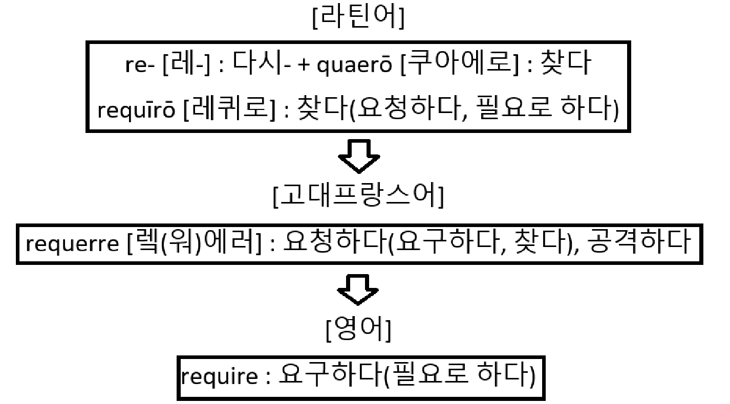 '다시 찾다(다시 탐색하다)'라는 근본적인 뜻을 가지는 require은 '없어진 것을 다시 찾고 알아내다->없어진 것을 다시 찾고 알아내기 위해 요청하다'라는 뜻으로 쓰이게 됩니다.
