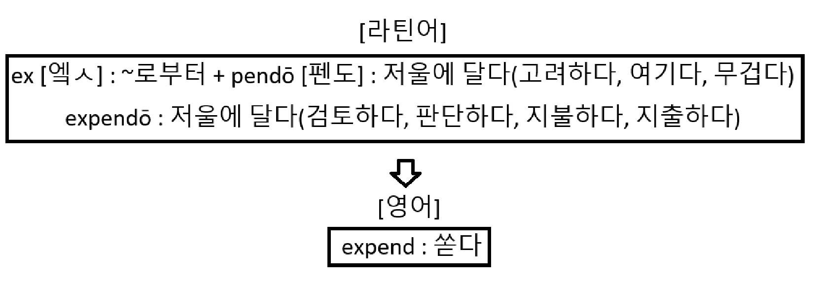 '~로부터 저울달다'라는 근본적인 뜻을 가지는 expendō [엨ㅅ판도]는 '저울달다->(값을) 계산하다->(돈, 시간, 노력 등을) 쏟다'라는 뜻으로 의미가 변하며 expend가 등장합니다.