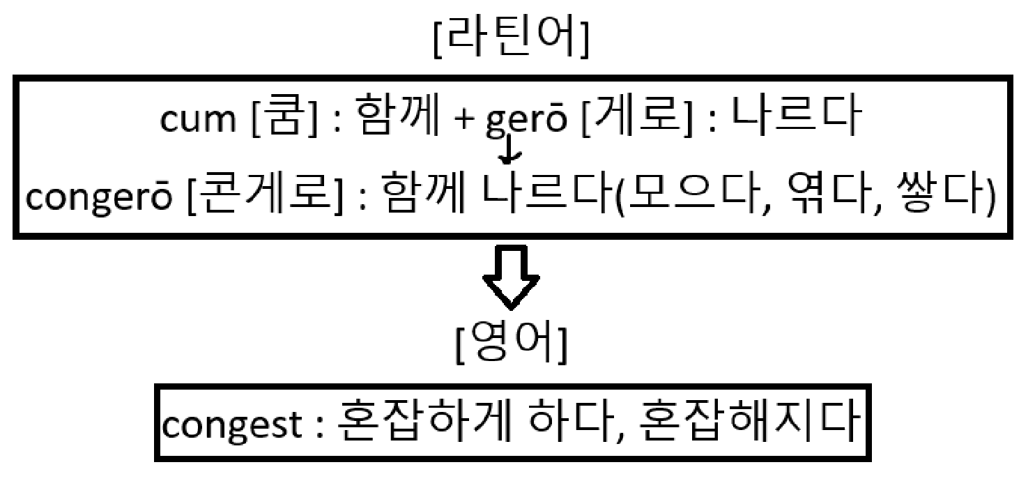 근본적으로 '함께 나르다'라는 뜻에서 '함께 날라 (쌓아 올리다)'라는 뜻으로 변한 라틴어 동사 congerō [콘게로]에서 '함께 날라 쌓아 올리다->함께 날라 쌓아 올려져 꽉 들어차다->과하게 모여서 혼잡해지다'라는 뜻으로 확장되며 congest가 등장합니다.