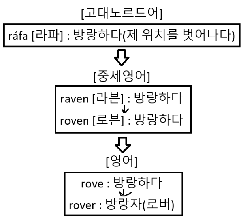 '제 위치를 벗어나다(방랑하다)'라는 뜻의 고대노르드어 ráfa [라파]에서 '방랑하다'라는 뜻의 중세영어 raven과 roven이 등장했고, 이 표현이 현대 영어 rove로 전해집니다. 이 동사에 행위자를 뜻하는 접미사 -er이 붙어 rover이 등장합니다.