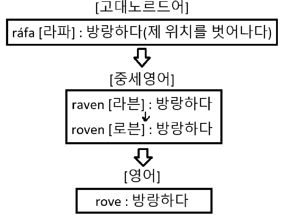 '제 위치를 벗어나다(방랑하다)'라는 뜻의 고대노르드어 ráfa [라파]에서 '방랑하다'라는 뜻의 중세영어 raven과 roven이 등장했고, 이 표현이 현대 영어 rove로 전해집니다.