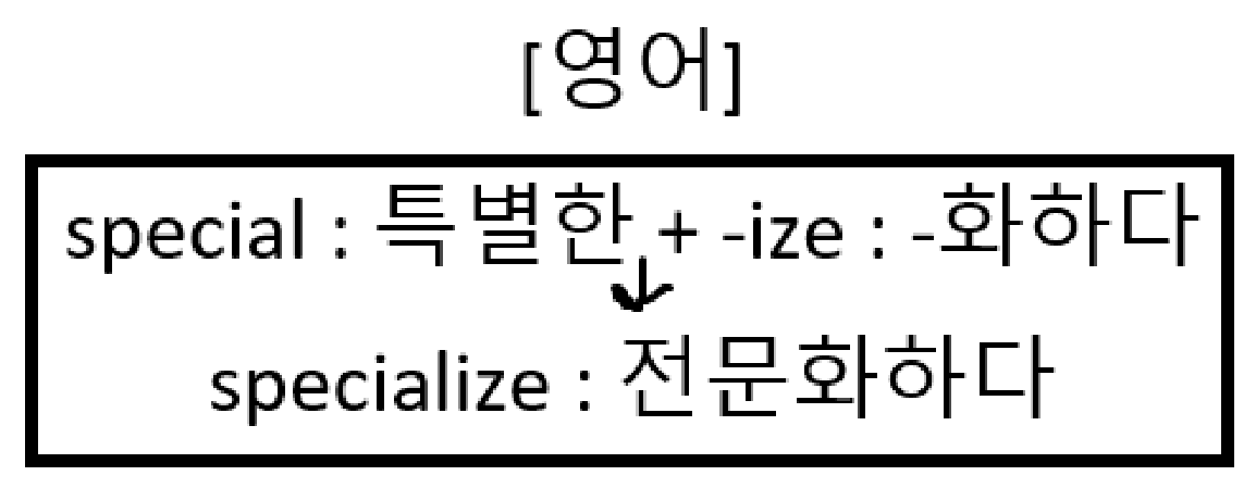 '특별한, 특수한'이란 뜻의 형용사 special에 '-화하다'란 뜻의 접미사 -ize가 붙어 specialize가 등장합니다.