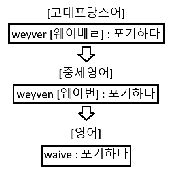 영어 단어 waive는 고대 프랑스어 동사 weyver(포기하다)에서 유래되었습니다. 이 단어는 -weyv-라는 어근과 동사화 어미 -er로 구분할 수 있지만, 어근 -weyv-에 대한 명확한 정설은 아직 존재하지 않습니다. 따라서 학술적으로 확실히 검증된 범위까지만 위 표로 정리했습니다.
