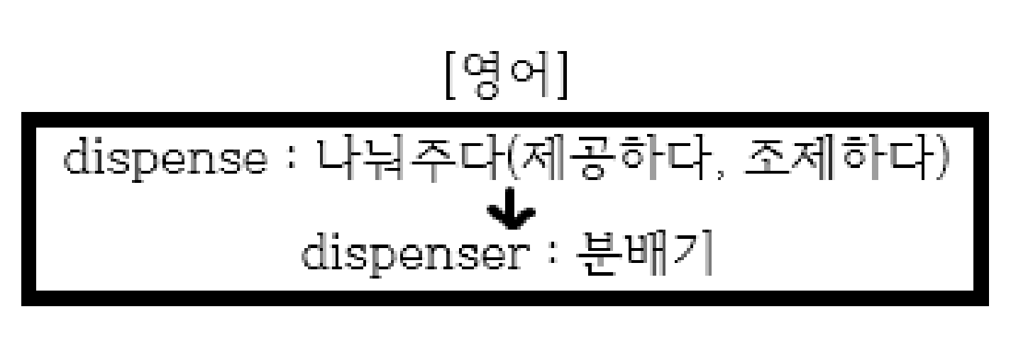 '나눠주다'라는 뜻의 타동사 dispense에 행위자를 뜻하는 접미사 -er이 붙어 dispenser이 등장합니다.