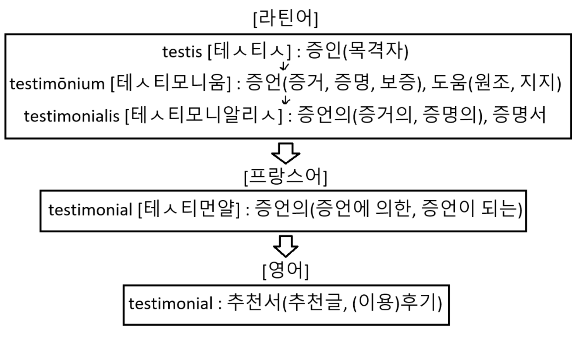 라틴어로 '증인(testis)이 된 상태(-mōnium)'라는 뜻의 중성명사 testimōnium[테ㅅ티모니움]에서 '증언->증언의->증언으로서 역할하는 것'이라는 뜻을 거쳐 tesimonial이라는 단어가 등장합니다.