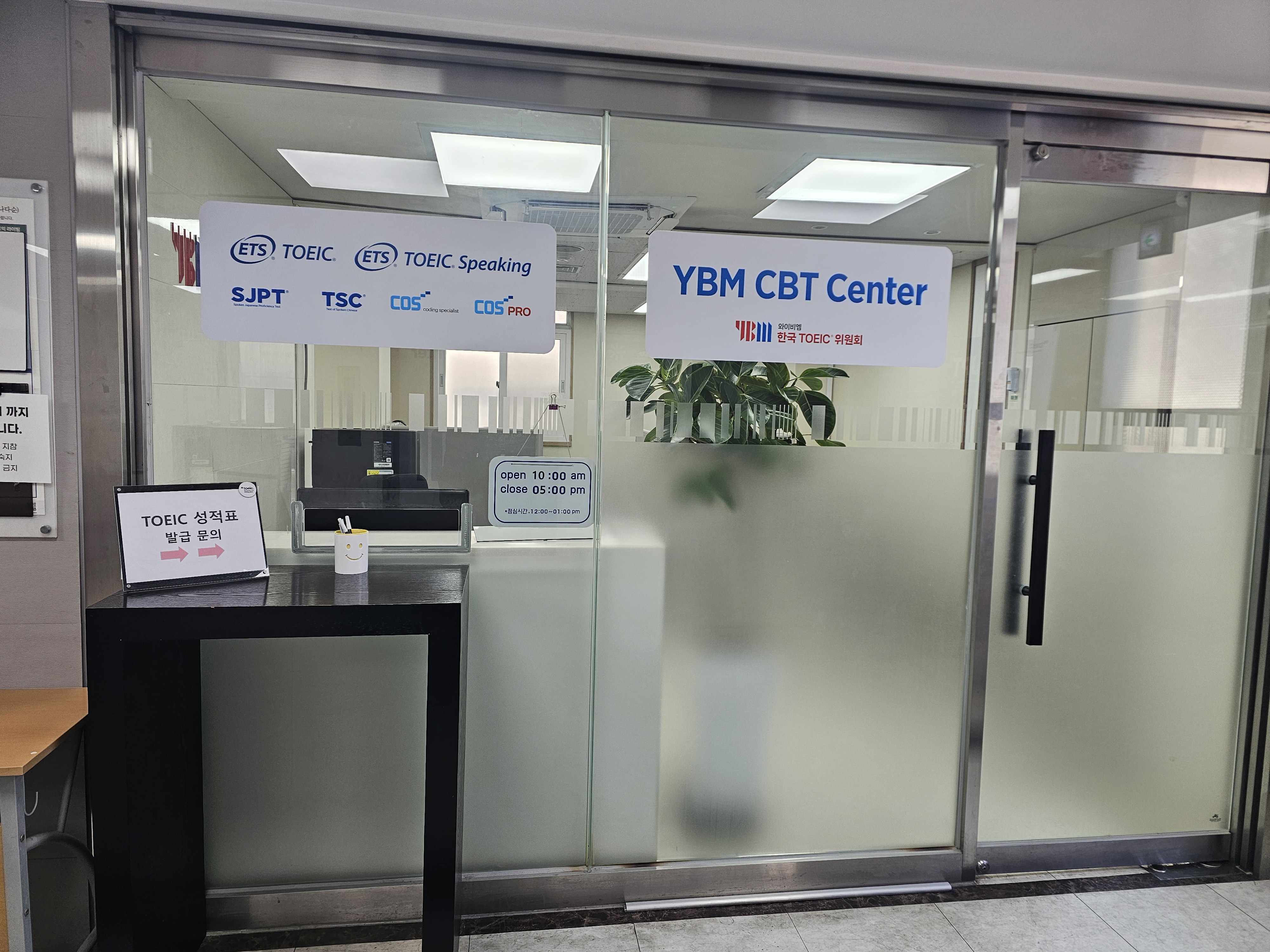 이곳 왼편 입구로 들어가 엘리베이터를 타고 5층에 내리면 YBM CBT센터가 있습니다. 이곳에서 토익 성적표를 발급받을 수 있습니다. 이곳에서는 점심시간인 12시부터 오후 1시까지를 제외한 오전 10시부터 오후 5시까지 성적표를 발급받을 수 있습니다.